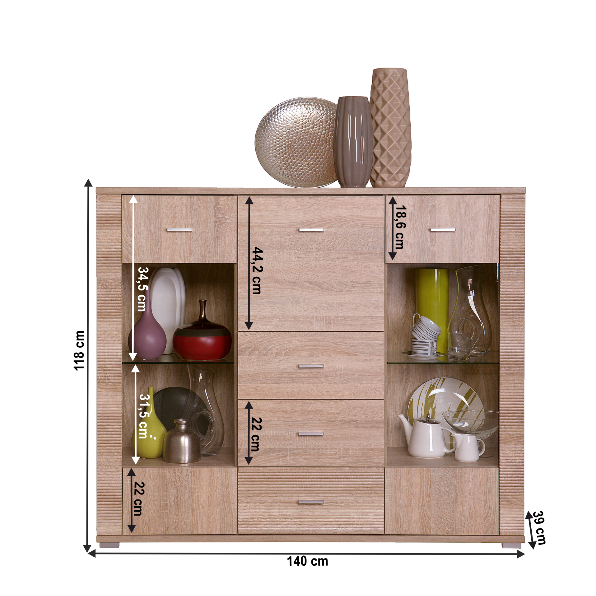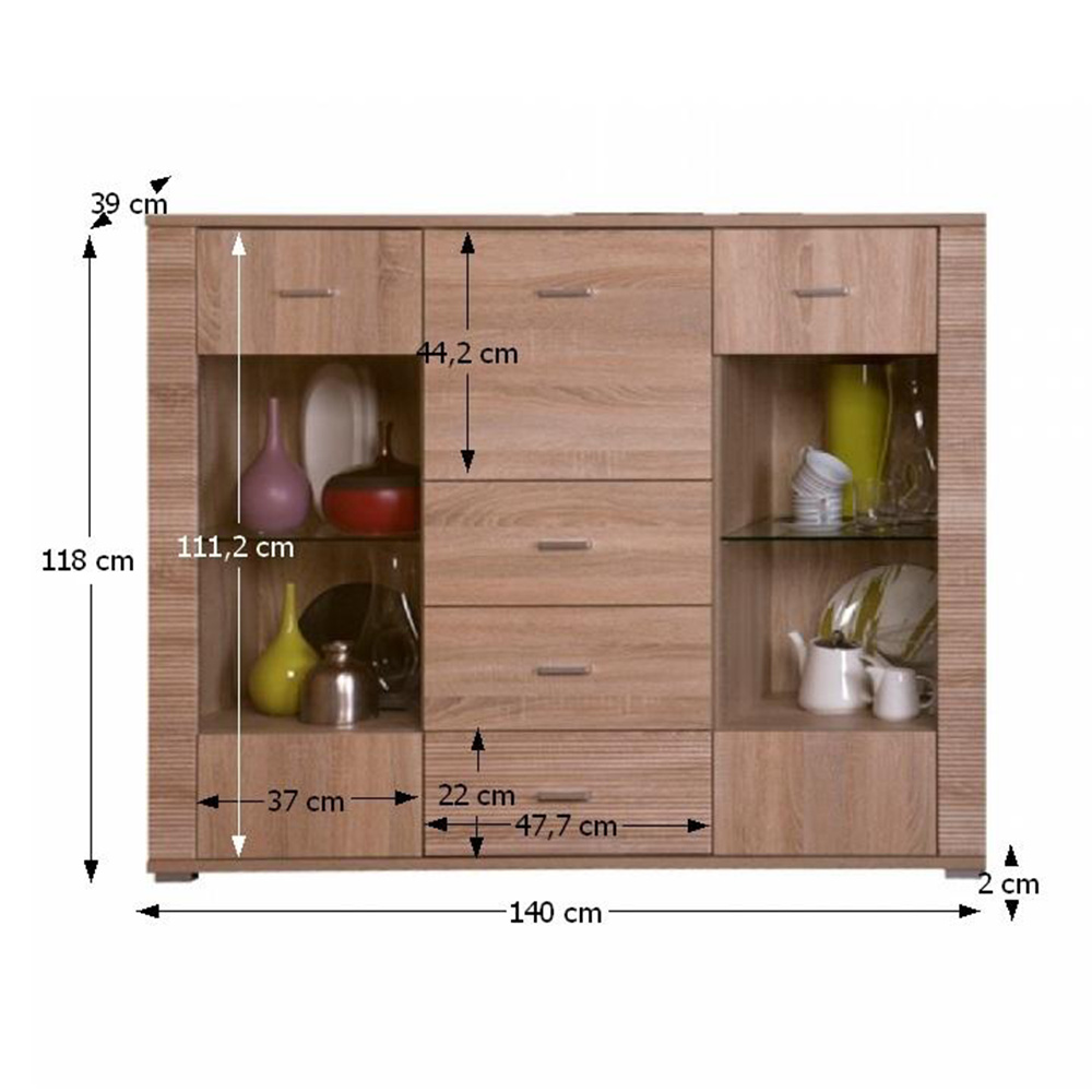 Komoda dvoudveřová typ 09, se 4 zásuvkami, vhodný na zařízení obývacích pokojů, ložnic i pracoven, materiál: DTD laminovaná. Hrany jednotlivých komponentů jsou ukončeny vroubkovanou lištou. Barevné provedení: dub sonoma. Rozměry (ŠxVxH): 140x96x39 cm. Tloušťka materiálu korpus: 16 mm Tloušťka materiálu vrchní desky: 22 mm Tloušťka materiá