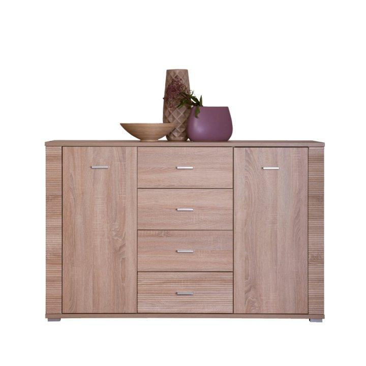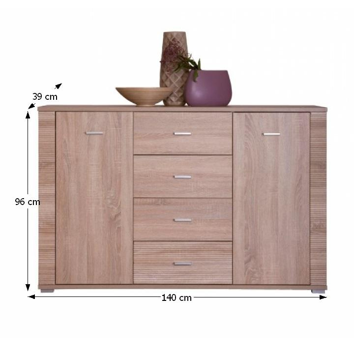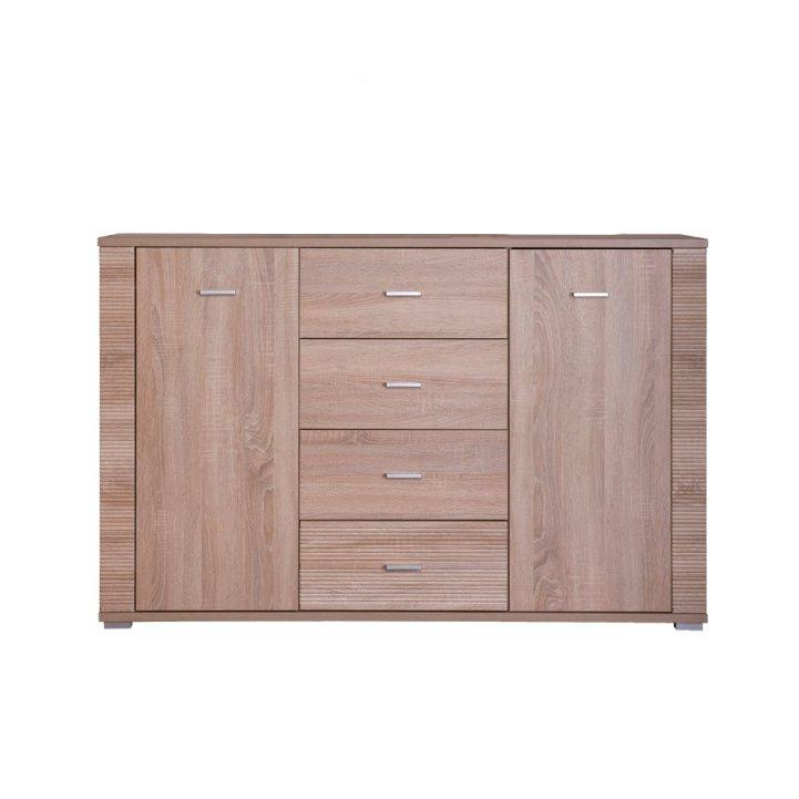 Komoda se 4 zásuvkami typ 11, vhodný na zařízení obývacích pokojů, ložnic i pracoven, materiál: DTD laminovaná. Hrany jednotlivých komponentů jsou ukončeny vroubkovanou lištou. Barevné provedení: dub sonoma. Rozměry (ŠxVxH): 92,8x94x34 cm. Tloušťka materiálu korpus: 16 mm Tloušťka materiálu vrchní desky: 22 mm Tloušťka materiálu spodní d