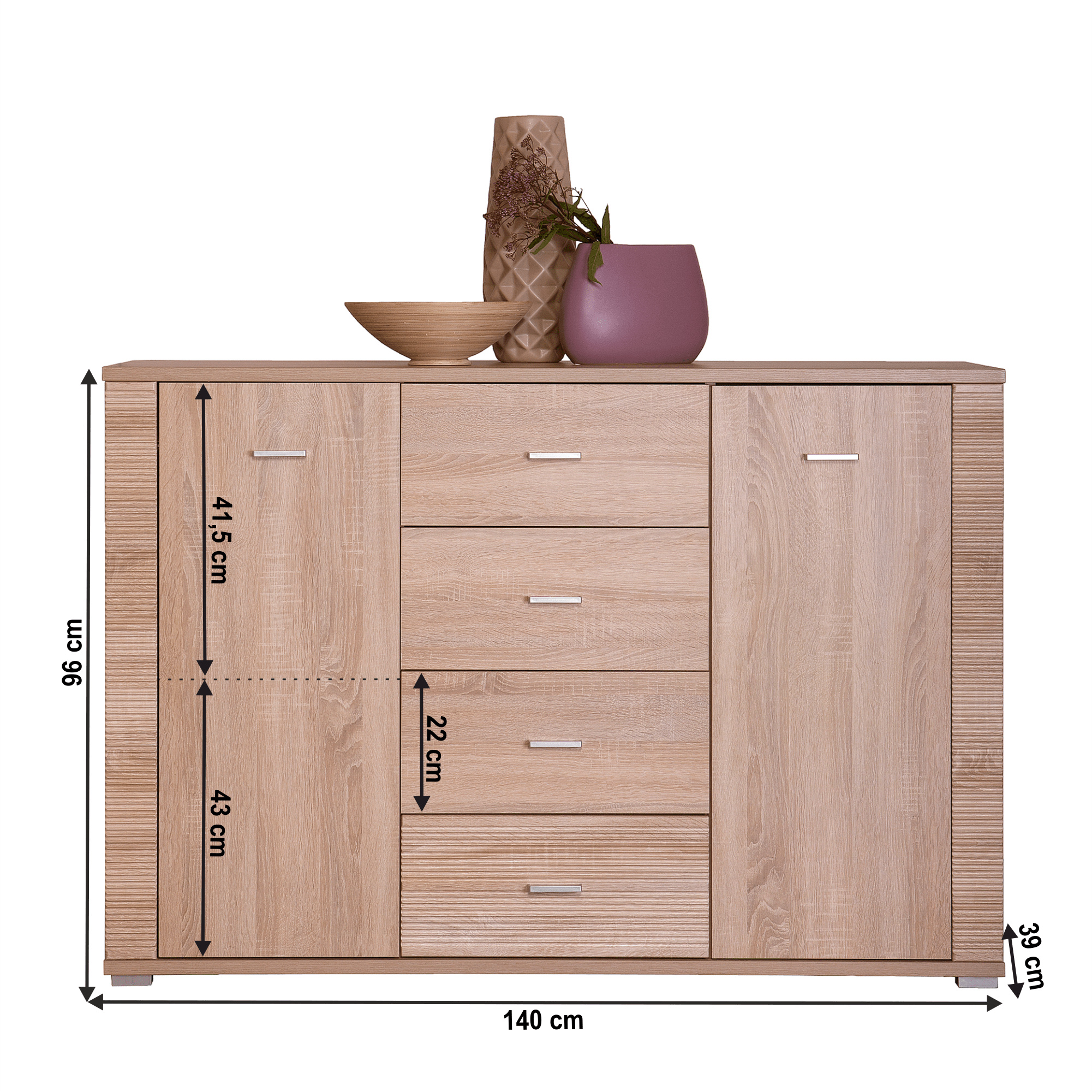 Komoda dvoudveřová typ 09, se 4 zásuvkami, vhodný na zařízení obývacích pokojů, ložnic i pracoven, materiál: DTD laminovaná. Hrany jednotlivých komponentů jsou ukončeny vroubkovanou lištou. Barevné provedení: dub sonoma. Rozměry (ŠxVxH): 140x96x39 cm. Tloušťka materiálu korpus: 16 mm Tloušťka materiálu vrchní desky: 22 mm Tloušťka materiálu spodní desky: 22 mm Dodávána v demontu, pouze na objednávku s dodací lhůtou 5-7 týdnů.