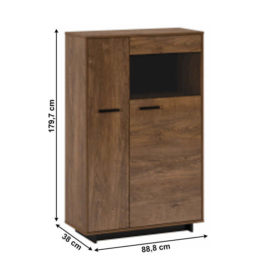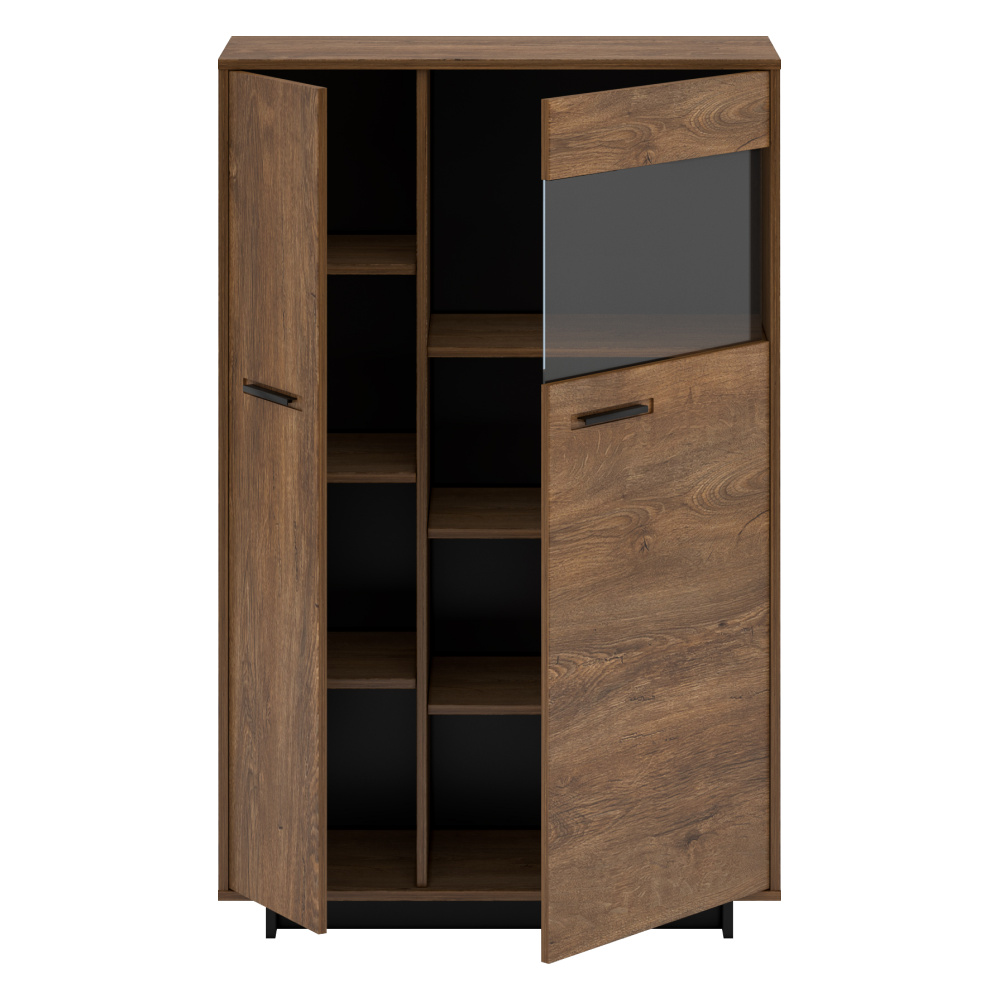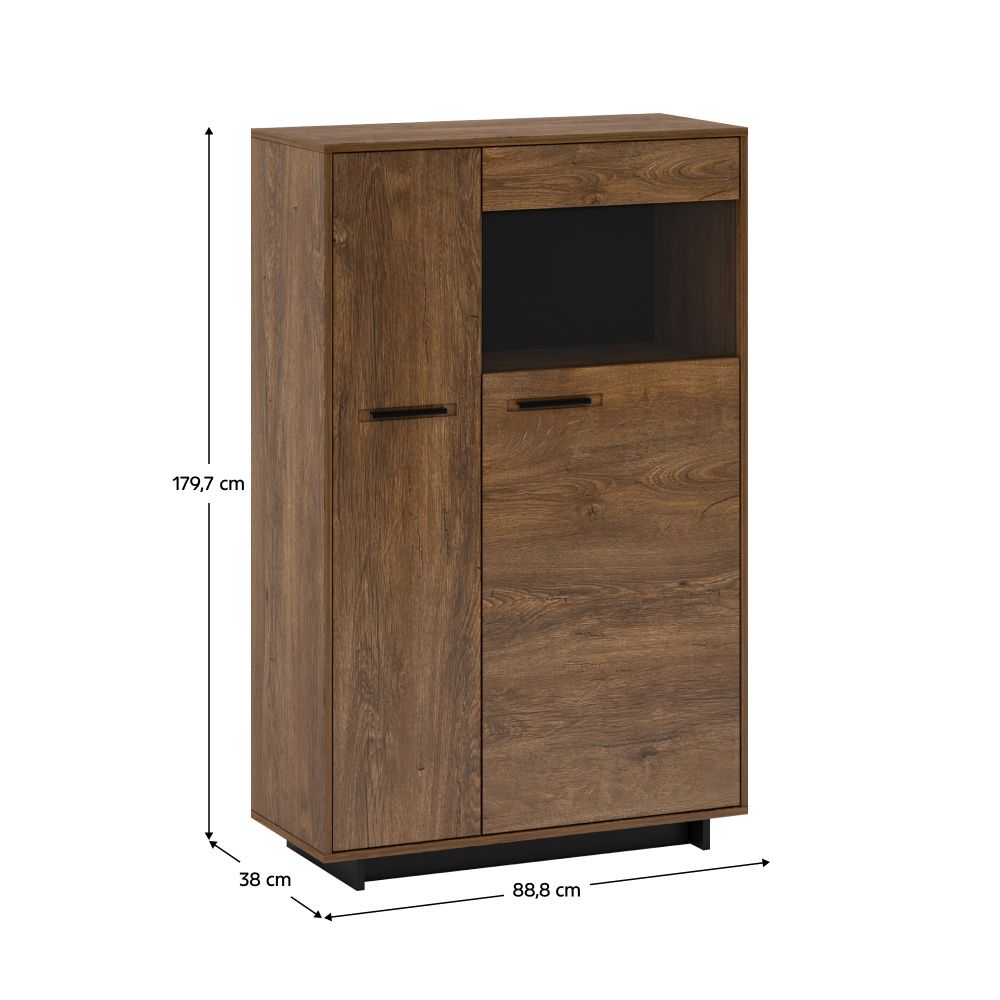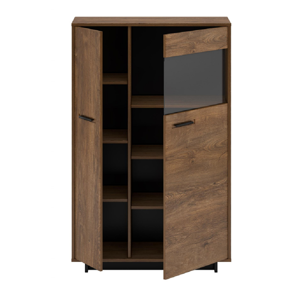 Materiál: DTD laminovaná / MDF fóliovaná/ sklo Barva: dub bolzano / černá Rozměry (ŠxHxV): 88,8x38x140 cm Tloušťka materiálu: 16 mm dvoudveřová Dvířka v kombinaci se sklem policová 6 police z DTD na podstavci Výška spodního prostoru od podlahy: 5 cm kovové úchytky pravé provedení Bez LED osvětlení Možnost dokoupit LED osvětlení v bílé barvě originální design Krásná kresba dřeva Do tradičního i moderního interiéru Do obývacího pokoje, pracovny i jídelny Dodávána v demontu