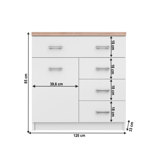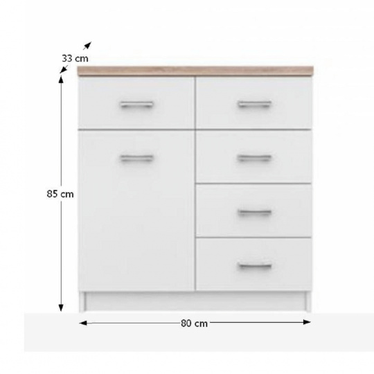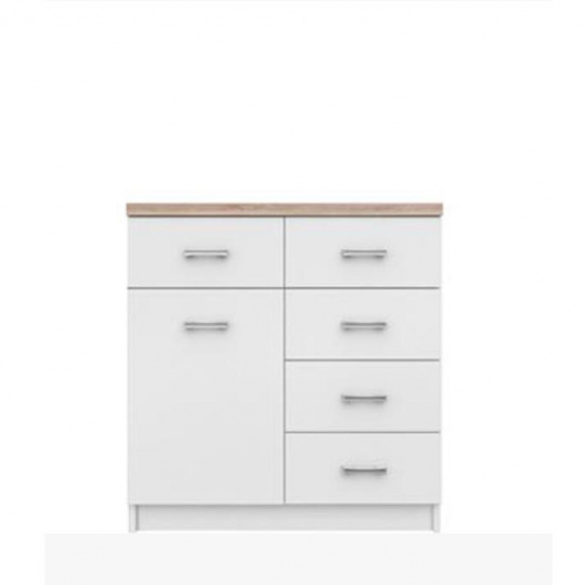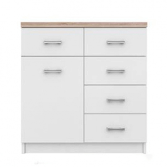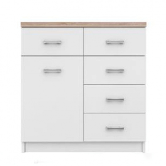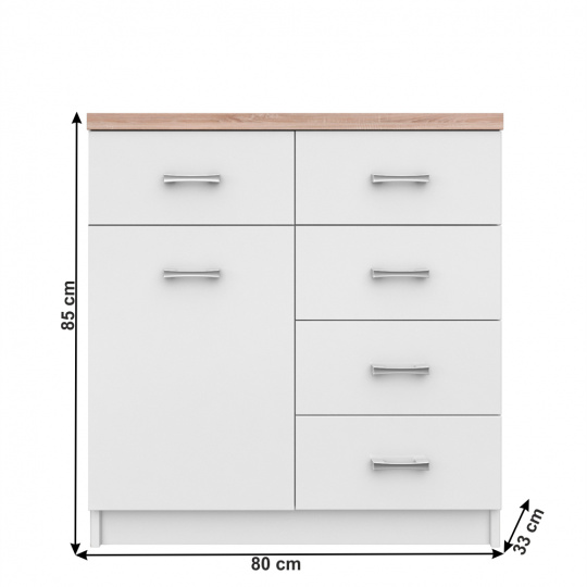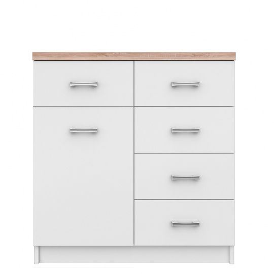 Komoda 1D4S TOPTY TYP 12 Materiál: DTD laminovaná Provedení: bílá / dub sonoma Rozměry (ŠxHxV): 80x33x85 cm Tloušťka materiálu korpus: 16 mm Tloušťka materiálu vrchní desky: 32 mm Dodávané v demontu.