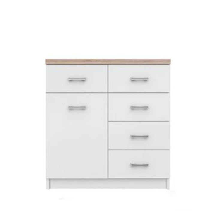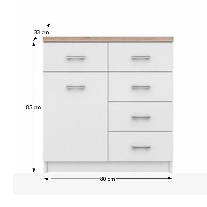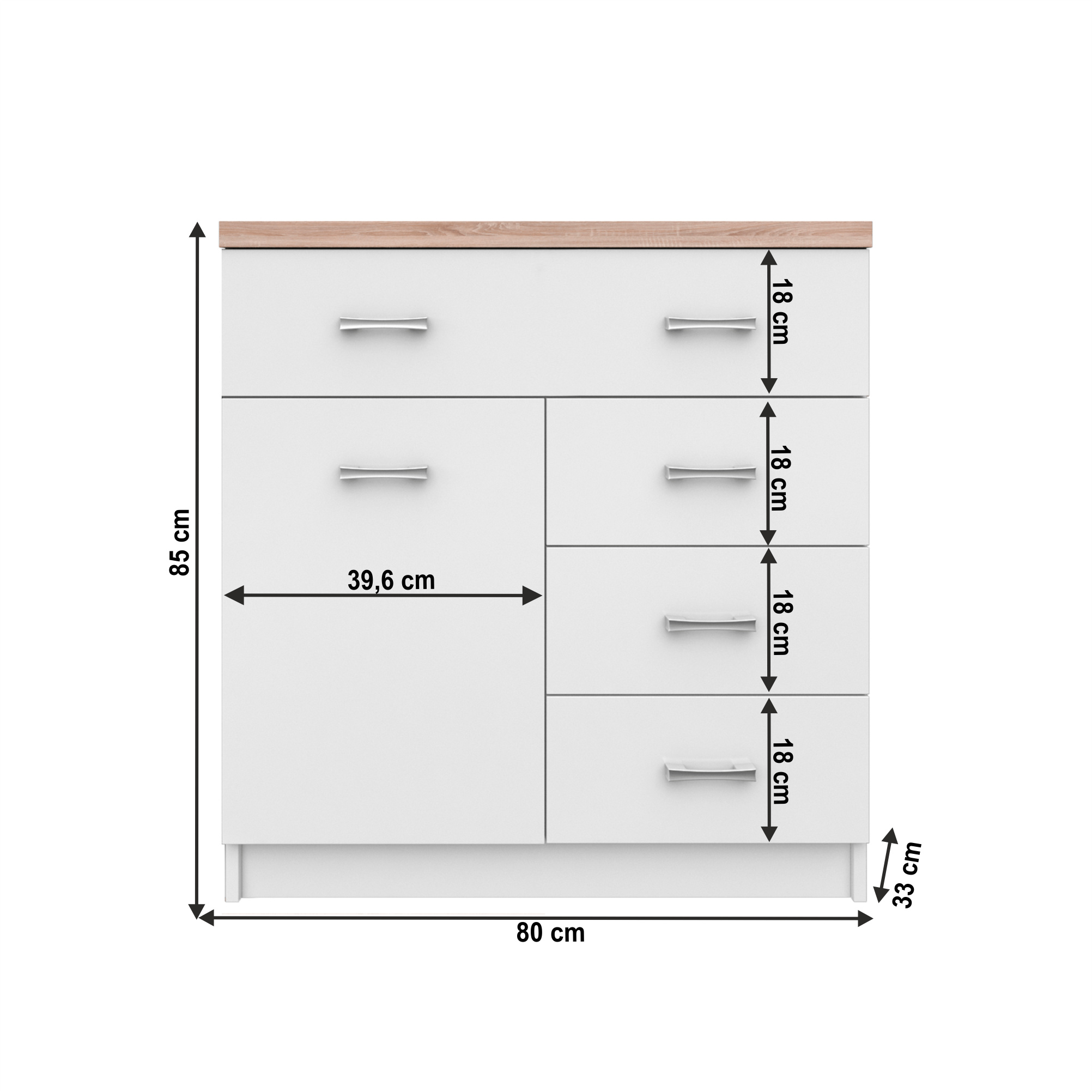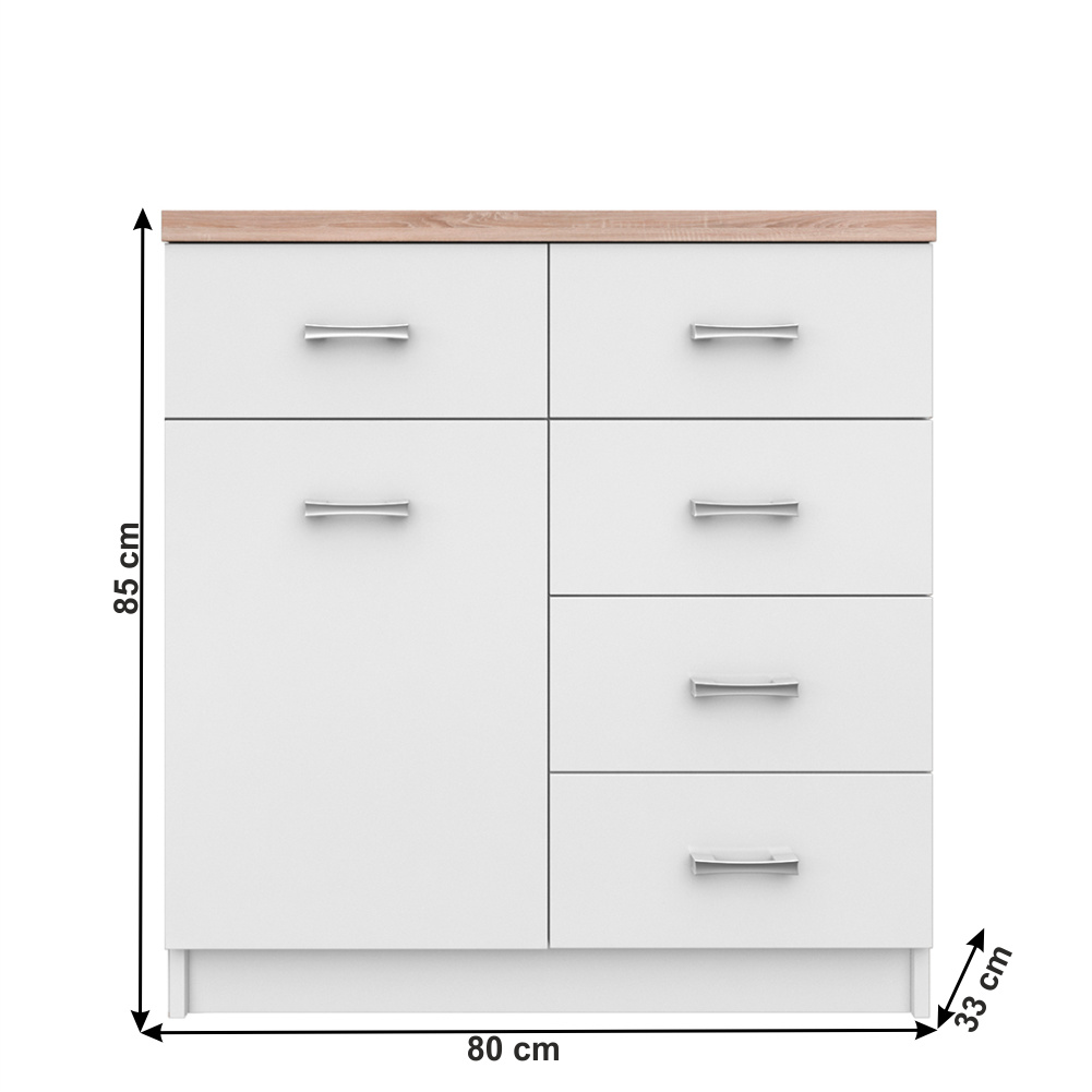 Komoda 1D4S TOPTY TYP 12 Materiál: DTD laminovaná Provedení: bílá / dub sonoma Rozměry (ŠxHxV): 80x33x85 cm Tloušťka materiálu korpus: 16 mm Tloušťka materiálu vrchní desky: 32 mm Dodávané v demontu.