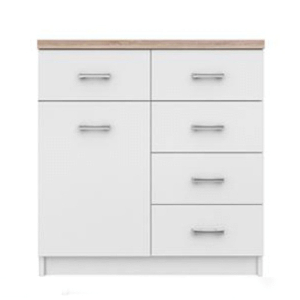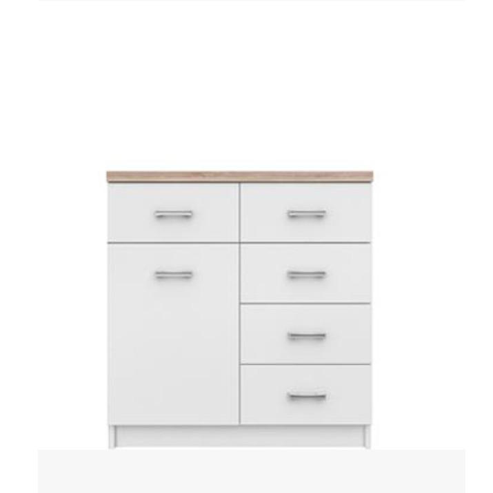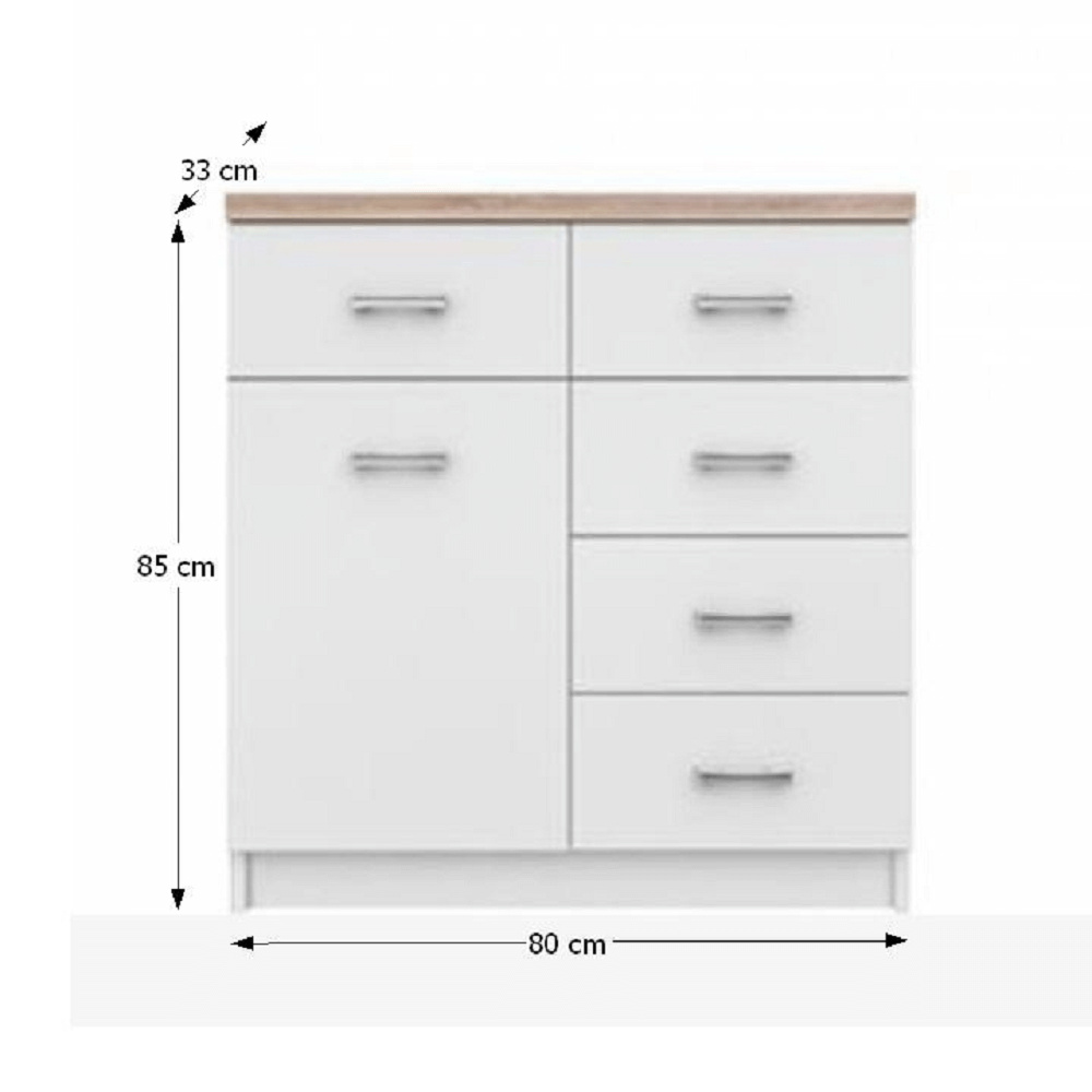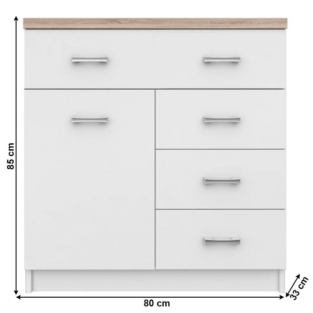 Komoda 1D4S TOPTY TYP 12 Materiál: DTD laminovaná Provedení: bílá / dub sonoma Rozměry (ŠxHxV): 80x33x85 cm Tloušťka materiálu korpus: 16 mm Tloušťka materiálu vrchní desky: 32 mm Dodávané v demontu.