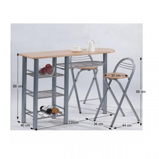 Kuchyňský barový pult se dvěma židlemi, BOXER Materiál: kov s povrchovým nátěrem aluminium / MDF Barva: buk, Rozměry stolu (ŠxHxV) 120x40x88 cm, Průměr židle: 39 cm, výška sedu: 60 cm Rozměr židle (ŠxHxV): 36x44x80 cm. Nosnost židle: 80 kg Tloušťka materiálu: 20 mm Dodávané v demontu.