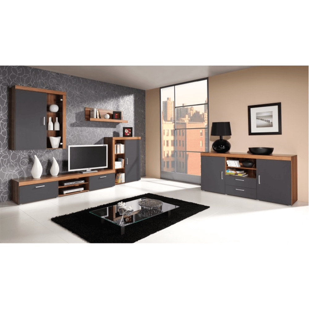 Obývací pokoj GENTA v barevném provedení bílá /šedá. Materiál laminovaná DTD a ABS hrany. Rozměry celé obývací stěny (ŠxHxV): 210x42x180 cm Rozměry RTV stolku (ŠxHxV): 160x42x32 cm Rozměry komody (ŠxHxV): 50x32x70 cm Rozměry závěsné vitríny (ŠxHxV): 50x22x67,5 cm Rozměry police (ŠxHxV): 60x18x20 cm Tloušťka materiálu: 16 mm Dodávané v dem
