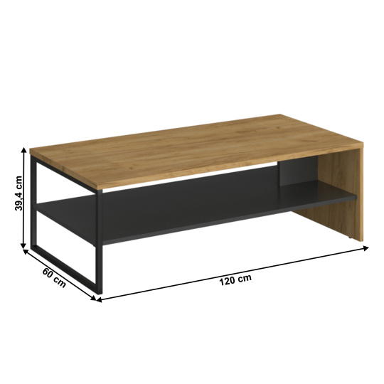 Konferenční stolek SANTANA 120 Materiál: DTD laminovaná Barva: dub craft zlatý/antracit Rozměry (ŠxHxV): 120x60x39,4 cm Tloušťka materiálu: 1,6 cm Police Nosnost police: 5 kg Dodávána v demontu