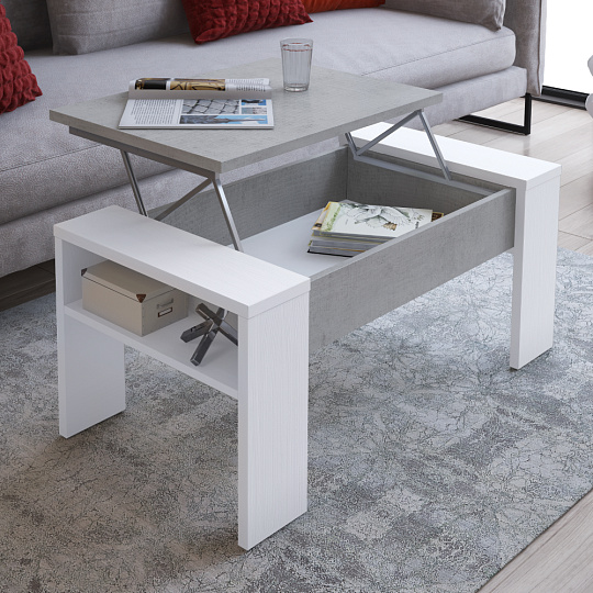 Konferenční stolek PULA Materiál: DTD laminovaná Barva: bílá/beton Rozměry (ŠxHxV): 98,4x50,2x42,6/54,1 cm Tloušťka materiálu vrchní plát: 2,2 cm Tloušťka materiálu korpus: 1,6 cm Výškově nastavitelná vrchní deska S ručním zdvihacím mechanismem S úložným prostorem pod vrchní deskou S policí Dodáváno v demontu