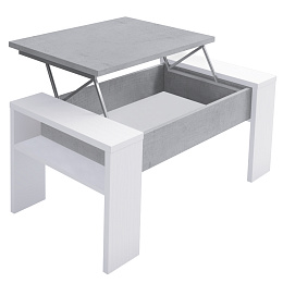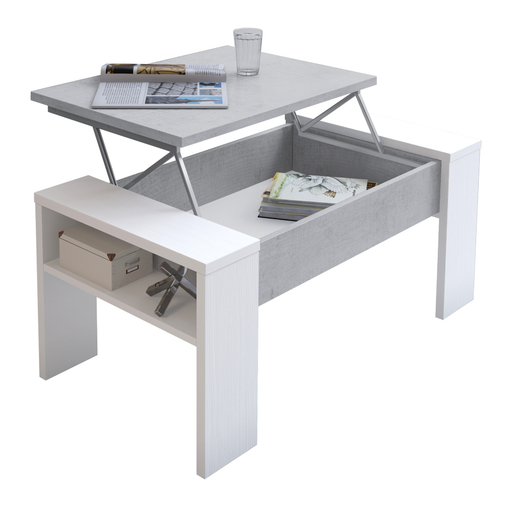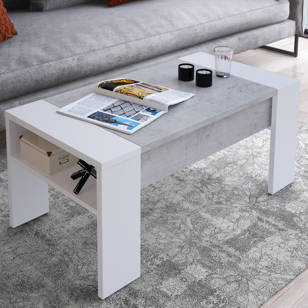 Konferenční stolek PULA Materiál: DTD laminovaná Barva: bílá/beton Rozměry (ŠxHxV): 98,4x50,2x42,6/54,1 cm Tloušťka materiálu vrchní plát: 2,2 cm Tloušťka materiálu korpus: 1,6 cm Výškově nastavitelná vrchní deska S ručním zdvihacím mechanismem S úložným prostorem pod vrchní deskou S policí Dodáváno v demontu