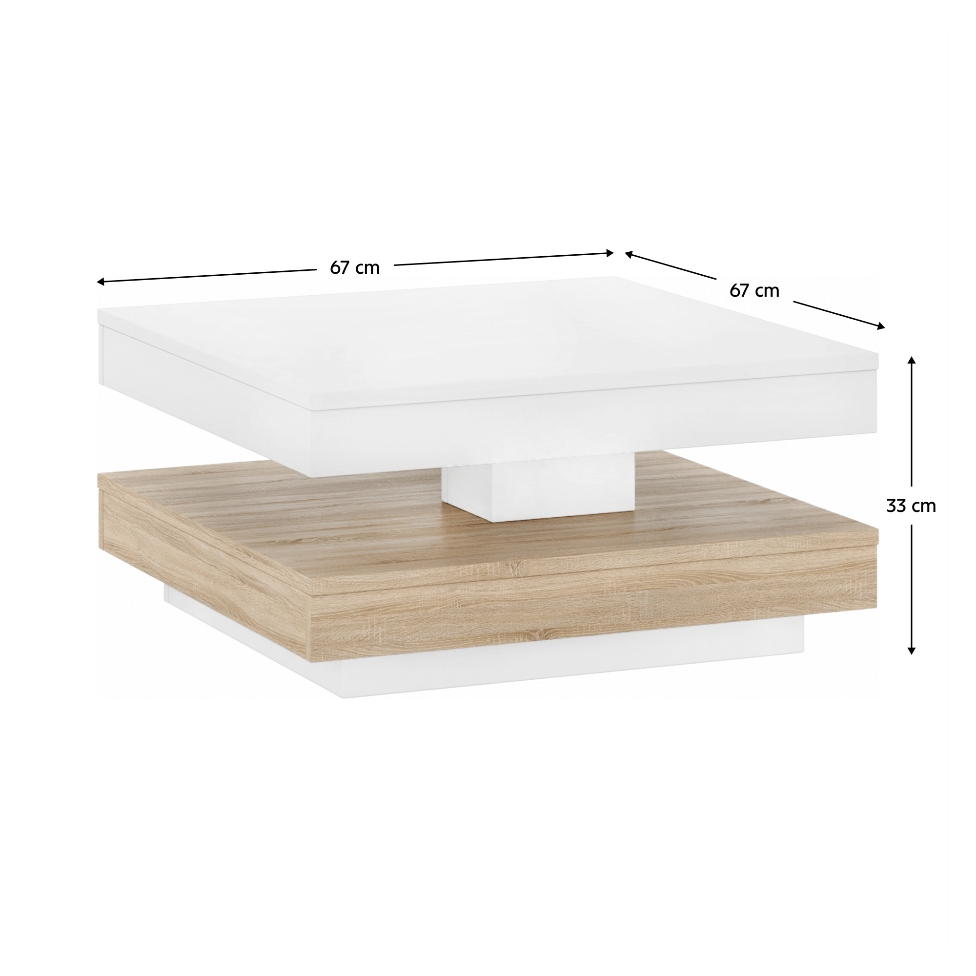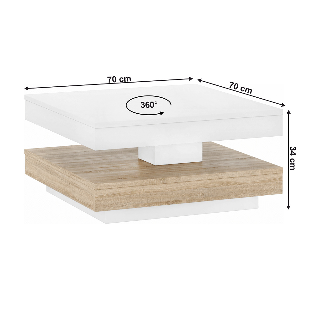 Materiál: DTD laminovaná Rozměry (ŠxHxV): 67x67x33 cm Barva: bílá/ dub sonoma Tloušťka materiálu: 1,8 cm Nosnost: max.15 kg Tvar stolu: čtvereční ABS hrany Otočná deska o 360° Dodáván v demontu