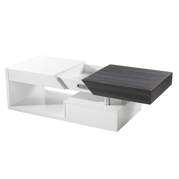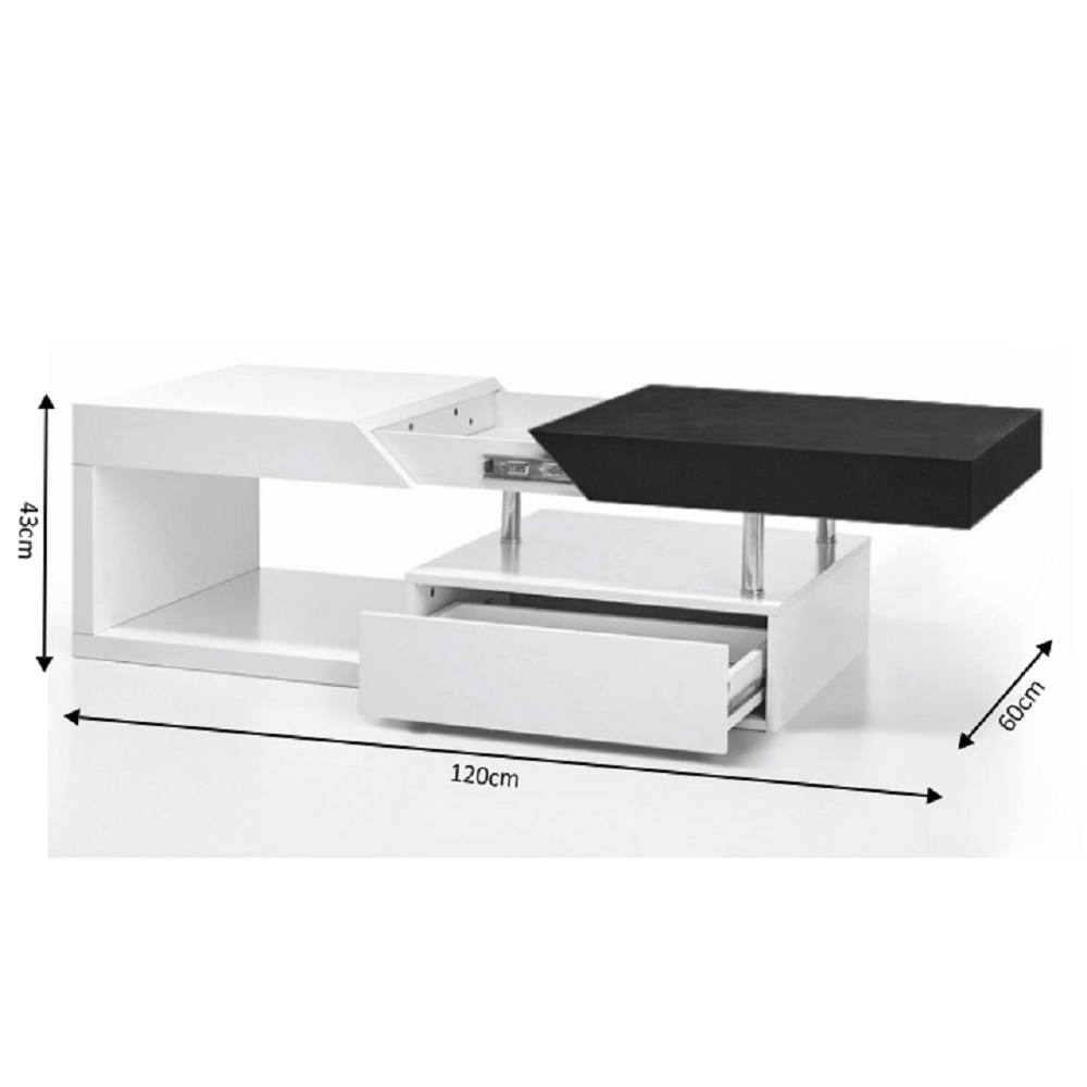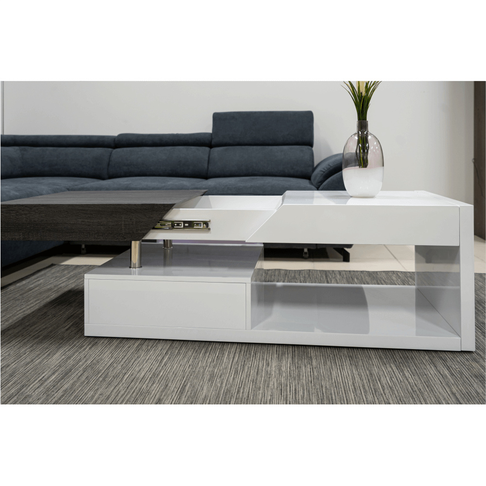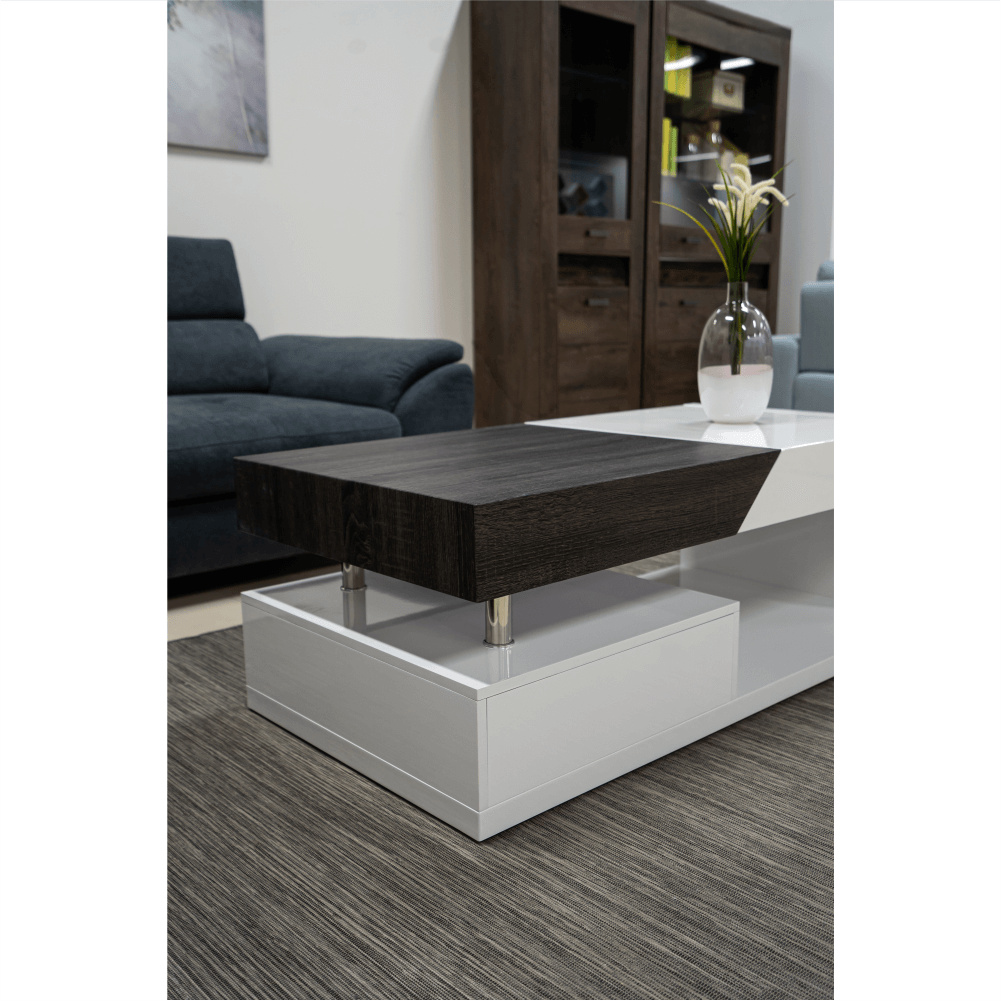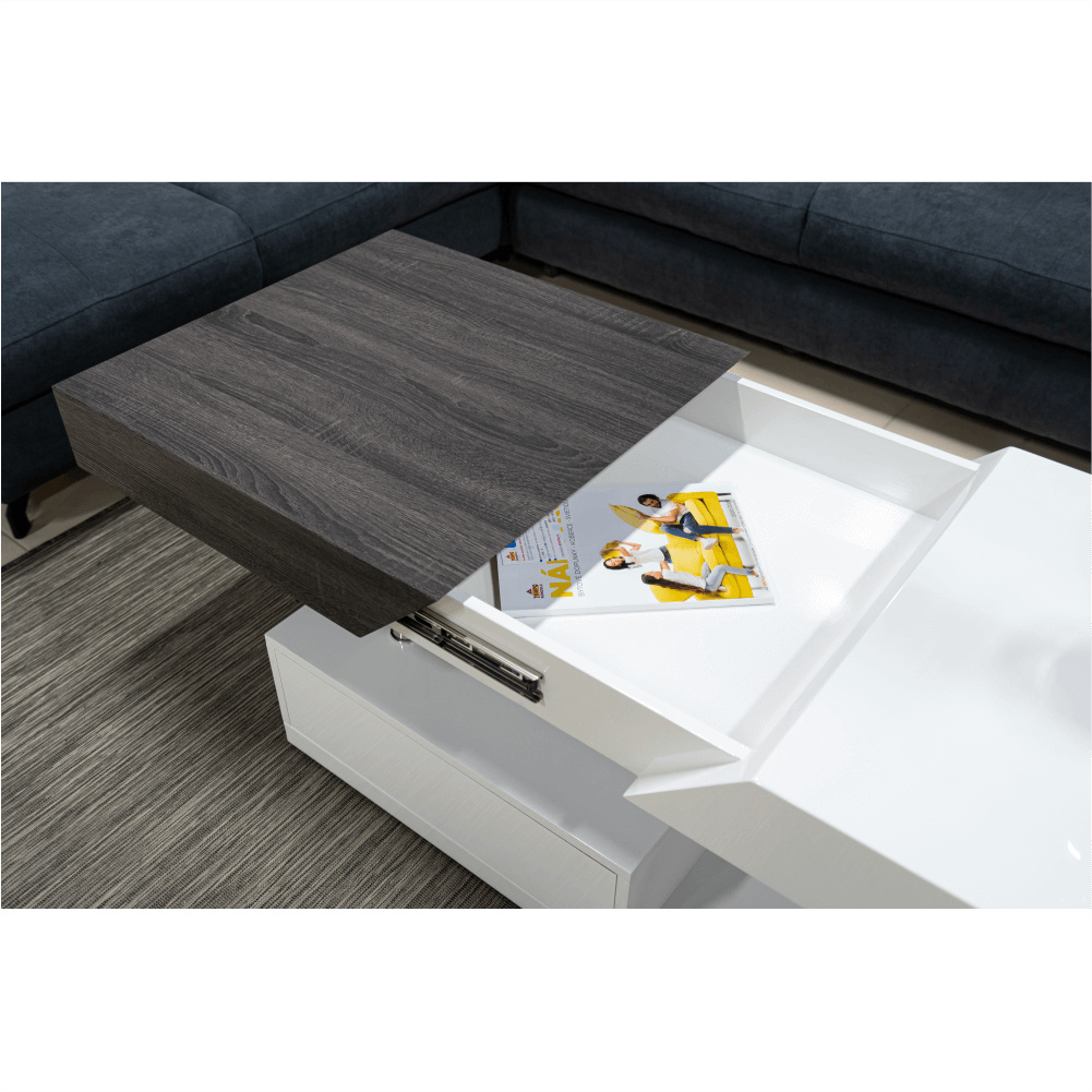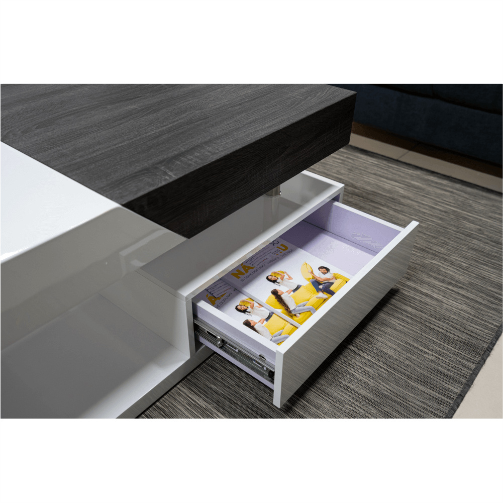 Konferenční stolek Barevné provedení: bílá HG / šedočerná s kresbou dřeva Materiál: MDF Rozměry (ŠxHxV): 120x60x43 cm Tloušťka materiálu: 12 mm Dodávané v demontu.