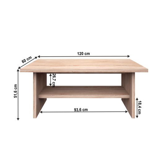 Konferenční stolek 120, NORTY TYP 15 Materiál: DTD laminovaná Provedení: dub sonoma Rozměry (ŠxHxV): 120x60x51,6 cm Tloušťka materiálu: 32 mm Tloušťka materiálu zbývající části: 16 mm Dodávané v demontu.