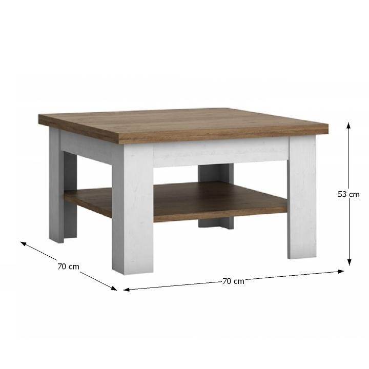 Konferenční stolek Provance v barevném provedení sosna andersen / dub lefkas. Materiál laminovaná DTD. Rozměry (ŠxHxV): 70x70x53 cm Tloušťka materiálu korpus: 22 mm Tloušťka materiálu vrchní desky: 36 mm Dodávané v demontu.