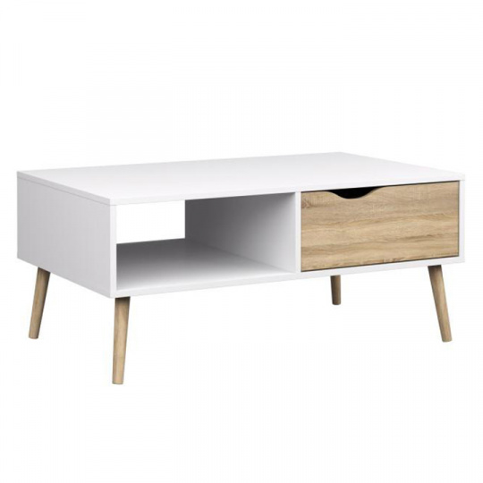 Konferenční stolek 75384 OSLO Materiál: DTD laminovaná Provedení: dub sonoma / bílá Rozměry (ŠxHxV): 98,6x60,10x42,6 cm Tloušťka materiálu: 1,6 cm Výška nohou: 15 cm Dodávané v demontu