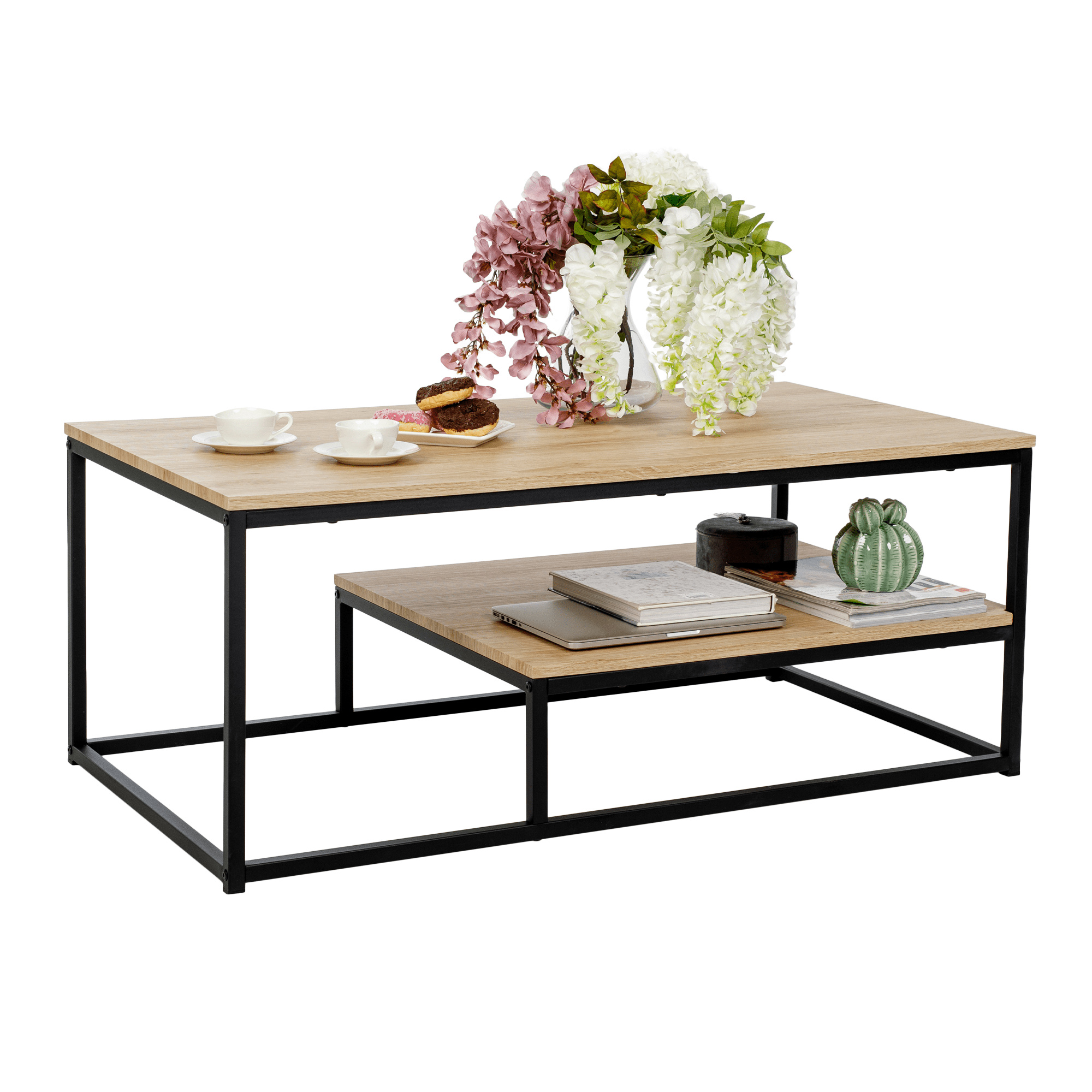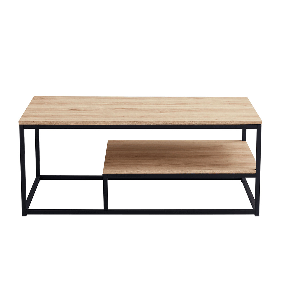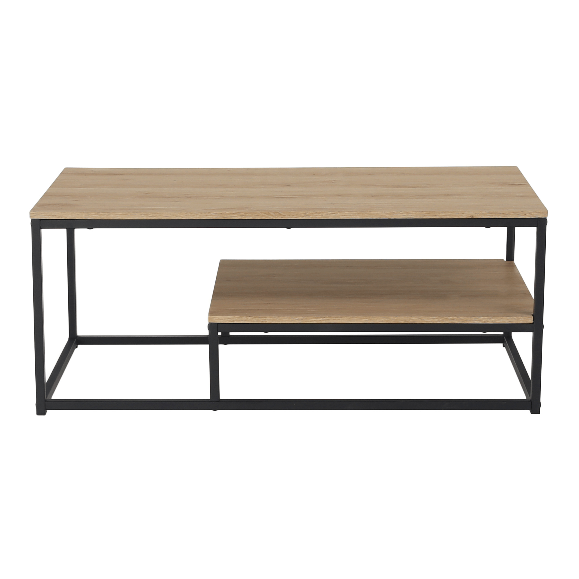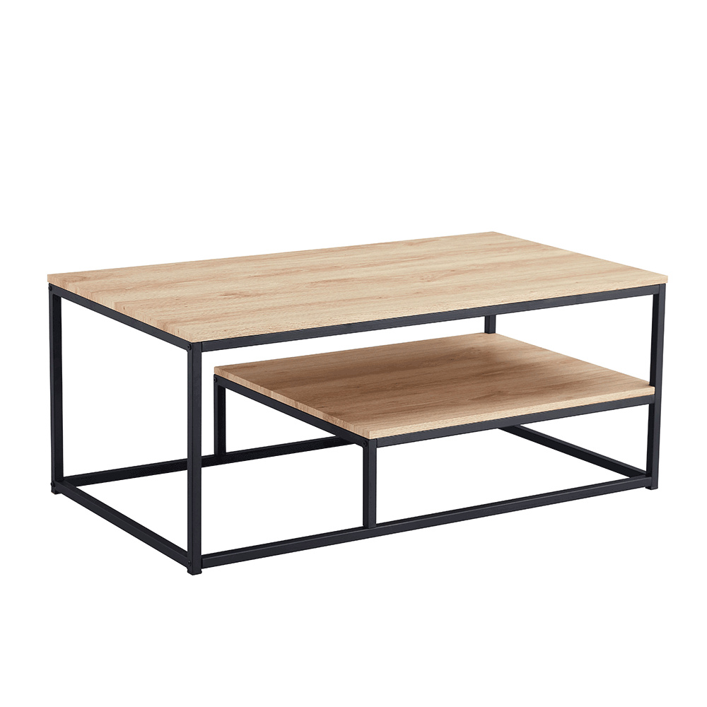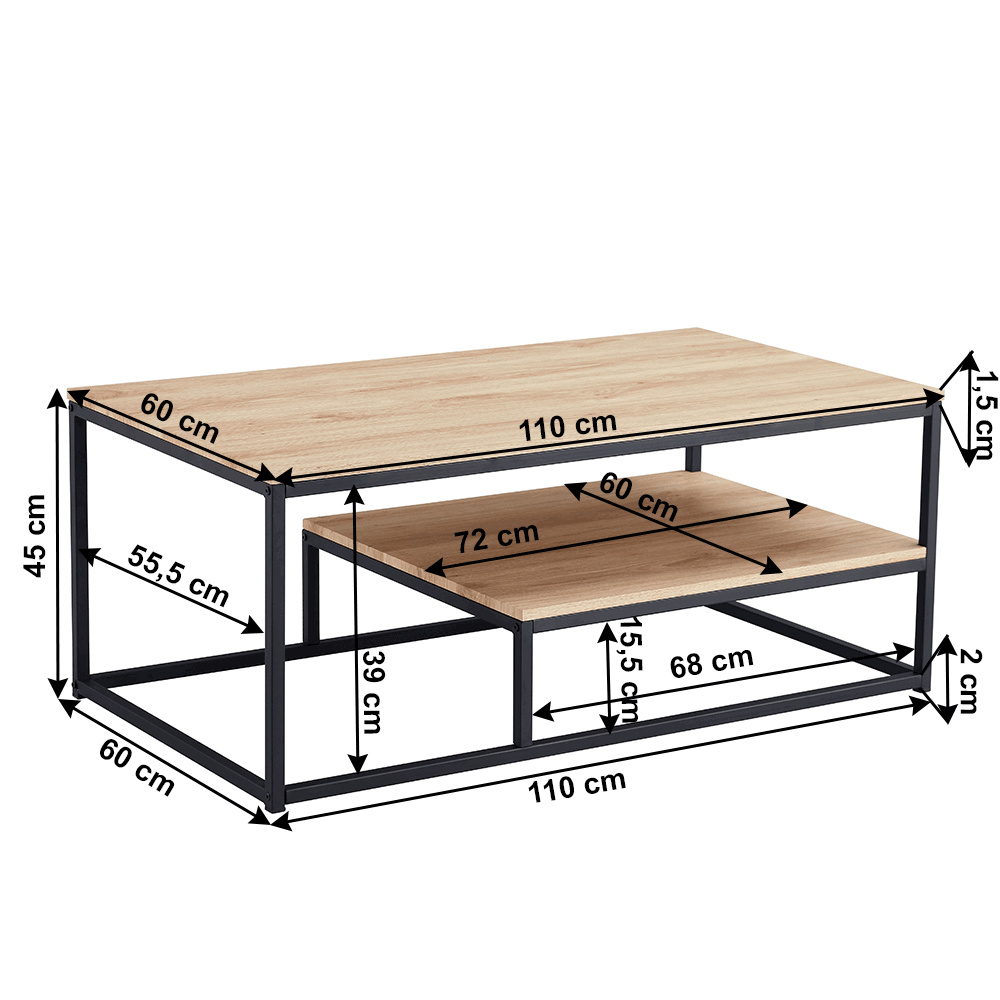 Barva: dub světlý / černá Materiál: MDF / kov Rozměry stolku (ŠxHxV): 110x60x45 cm Vnitřní hloubka stolku: 55,5 cm Rozměry police: (ŠxH): 72x60 cm Tloušťka konstrukce: 2x2x1 cm Tloušťka vrchní desky: 1,5 cm Tloušťka police: 1,5 cm Výška od země po polici: 15,5 cm Výška od police po vrchní desku: 39 cm designový praktický industriální styl S odkládacím a úložným prostorem Moderní a nadčasový Nosnost: 25 kg Dodávané v demontu