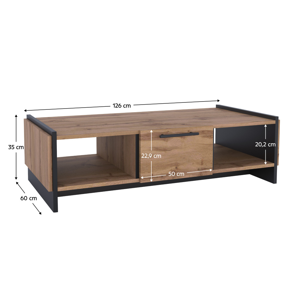 Materiál: DTD laminovaná/ABS hrany Barva: dub wotan/černá Rozměry (ŠxHxV): 126x60x35 cm Tloušťka materiálu: 1,6 cm Kovové úchytky Barva úchytek: černá Otevřený úložný prostor Výška otevřeného úložného prostoru: 20,2 cm Nosnost police: 5 kg Šuplík Rozměry šuplíku (ŠxV): 50x22,9 cm Nosnost šuplíku: 5 kg Nosnost vrchní desky: 5 kg Dvojitá laminovaná DTD Plastové nožičky Moderní design Doporučujeme připevnit ke stěně Dodáváno v demontu