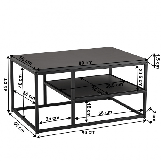 Barva: grafitová / černá Materiál: MDF / kov Rozměry stolku (ŠxHxV): 90x60x45 cm Vnitřní hloubka stolku: 56 cm Vnitřní výška stolku: 40 cm Rozměry police (ŠxH): 58,5x56 cm Tloušťka konstrukce: 2x2x1 cm Tloušťka vrchní desky: 1,5 cm Tloušťka police: 1,5 cm Výška od země po polici: 18 cm Výška od police po vrchní desku: 20,5 cm designový praktický industriální styl S odkládacím a úložným prostorem Moderní a nadčasový Nosnost: 25 kg Dodávané v demontu