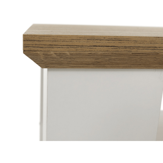 Materiál: DTD laminovaná / ABS hrany Barva: bílá / dub grand Rozměry (ŠxHxV): 120x60x55 cm Tloušťka materiálu: 40 mm S policemi S 3D efektem elegantní V provensálském stylu kovové úchytky Dodávané v demontu