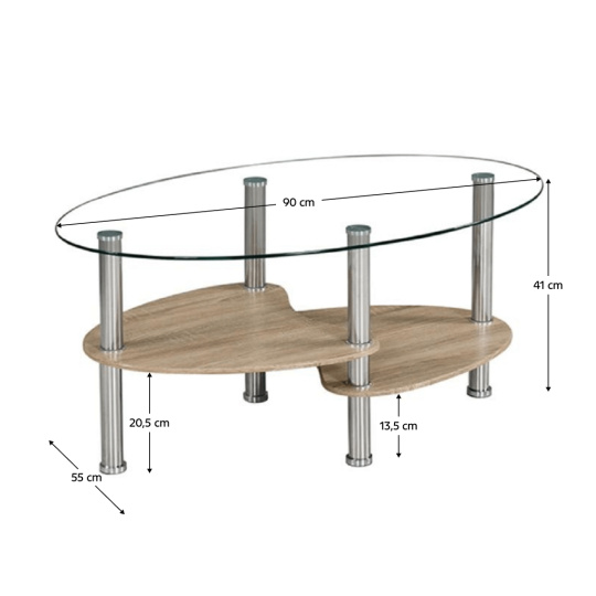 Materiál: ocel/sklo/MDF Barva: dub sonoma Rozměry (ŠxHxV): 90x55x41 cm Tloušťka materiálu: 9 mm Se dvěma policemi Dodáváno v demontu