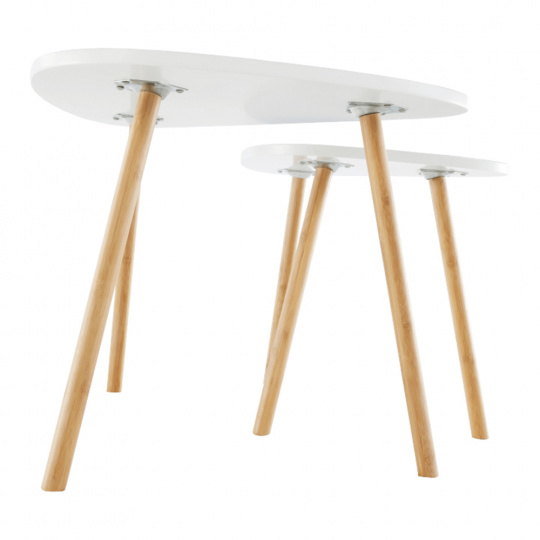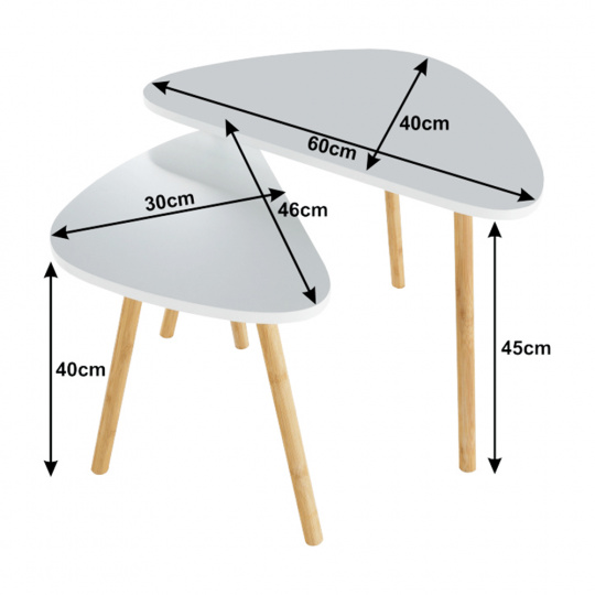 Sada dvou konferenčních stolků BISMAK Materiál: MDF / lakovaný bambus Barva: bílá / přírodní bambus Rozměry menšího stolku (ŠxHxV): 46x30x40 cm Rozměry většího stolku (ŠxHxV): 60x40x45 cm Dodávané v demontu.