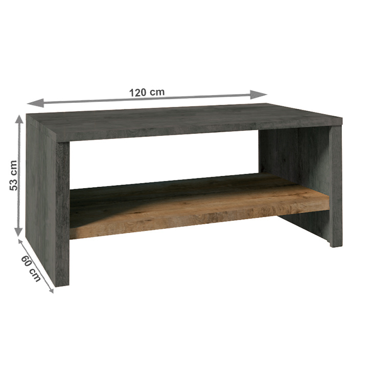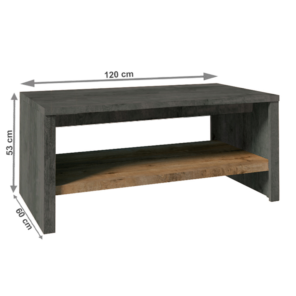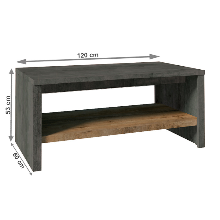 Konferenční stolek ST, MONTANA Materiál: DTD laminovaná / ABS hrany Barevné provedení: dub lefkas tmavý/smooth šedý Rozměry (ŠxHxV): 120x60x53 cm Tloušťka materiálu korpus: 22 mm Tloušťka materiálu vrchní desky: 15 mm Dodávané v demontu.