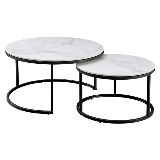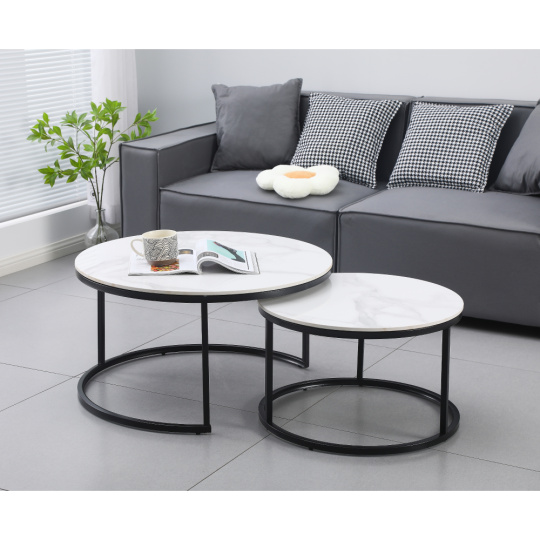 Materiál deska stolu: broušený kámen Barevné provedení: bílý mramor Konstrukce nohy: ocel Barevné provedení: černá Rozměry většího stolku (PxV): 80x43 cm Rozměry menšího stolku (PxV): 60x37 cm Tloušťka platu stolu: 1,1 cm Set 2 kusů Kulatý Moderní a stylový Nosnost: 30 kg Dodáváno v demontu