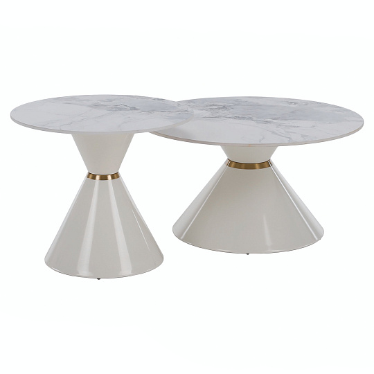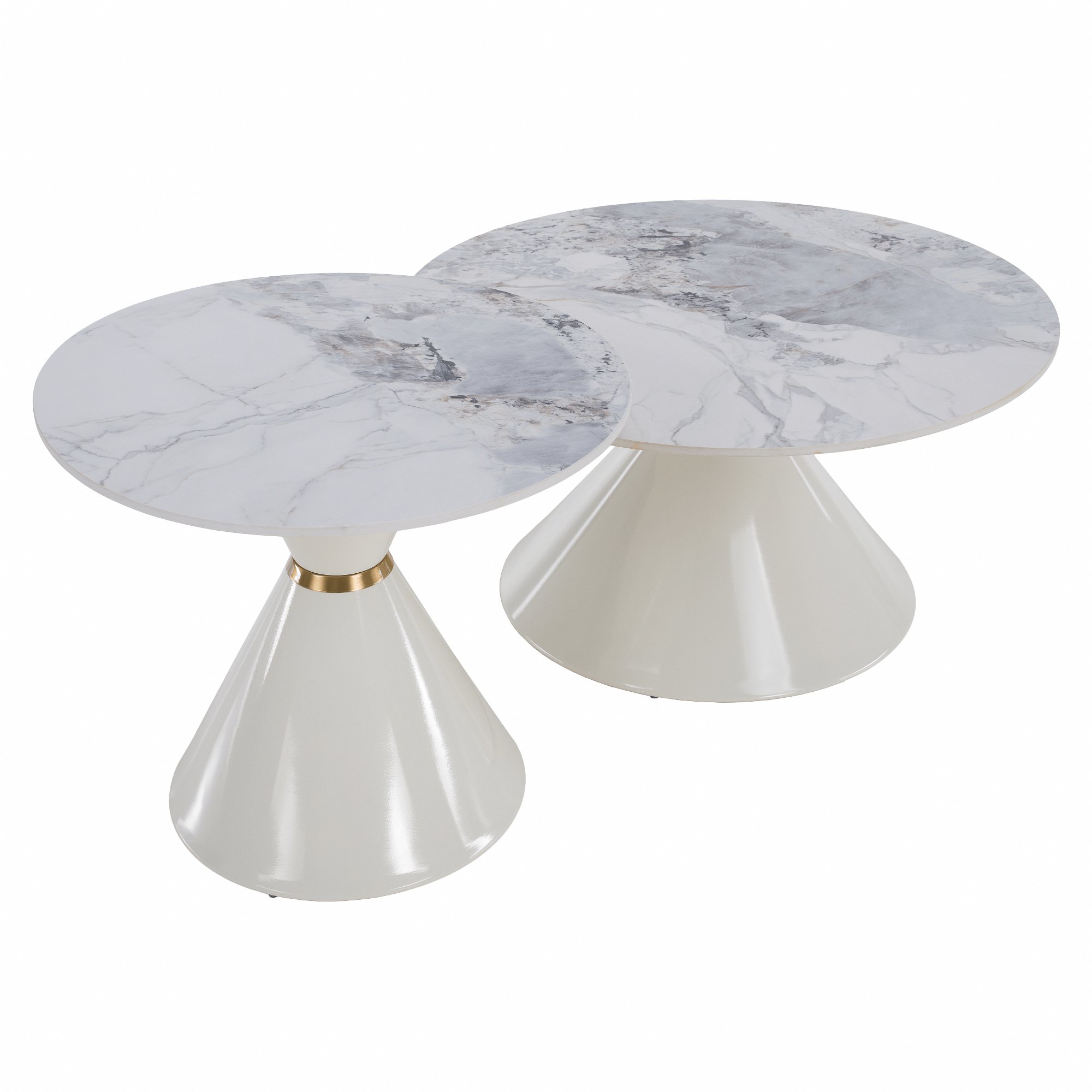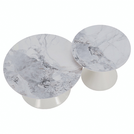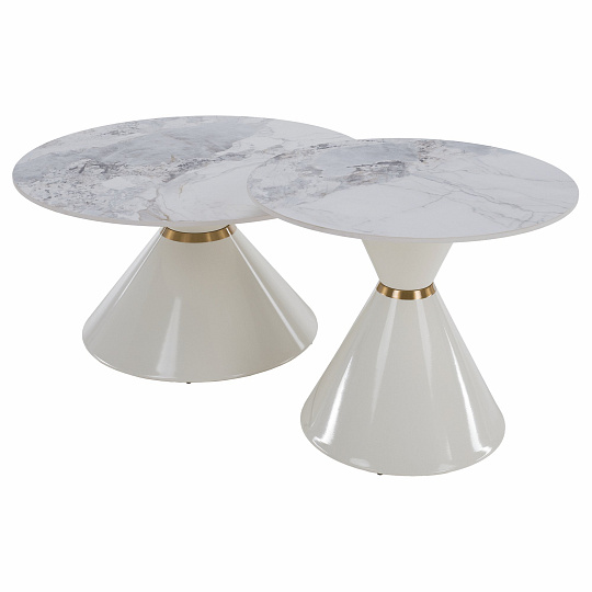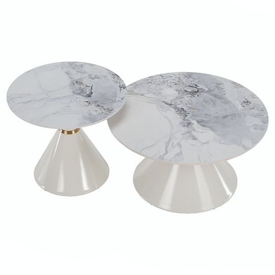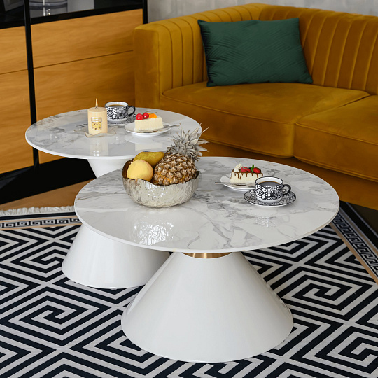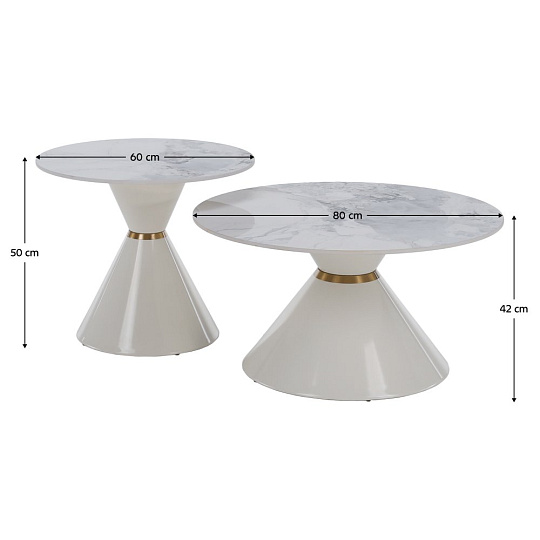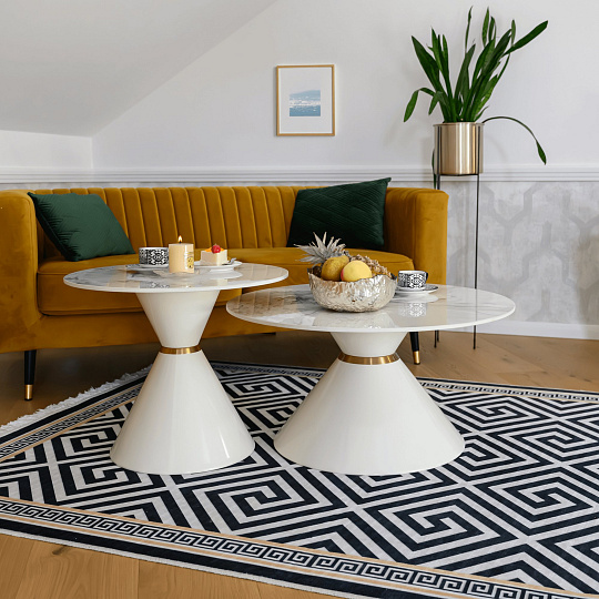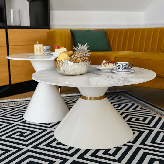 Materiál deska stolu: broušený kámen Barevné provedení: bílý mramor Konstrukce nohy: kov Barevné provedení: bílá Set 2 ks Rozměry většího stolku (PxV): 80x42 cm Rozměry menšího stolku (PxV): 60x50 cm Tloušťka platu stolu: 1,1 cm Zlatý dekorativní pásek Originální kousek Kulatý Moderní a stylový Nosnost: 30 kg Dodáváno v demontu