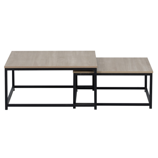 Materiál: MDF laminovaná/kov Barva: dub sonoma/černá Větší stolek (ŠxHxV): 75x75x37 cm Menší stolek (ŠxHxV): 65x65x32 cm Tloušťka materiálu: 1,5 cm Set 2 kusů Možnost zasunutí menšího pod větší stolek Moderní a stylový Nosnost většího stolku: 40 kg Nosnost menšího stolku: 30 kg Dodáváno v demontu