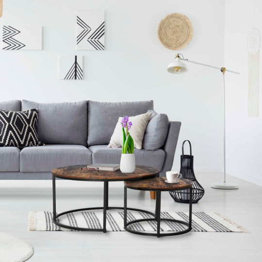 Materiál: DTD laminovaná/kov Barva: černá/ořech Větší stolek (průměr x V): 80x48 cm Menší stolek (průměr x V): 48x42 cm Tloušťka materiálu: 1,5 cm Nosnost: 40 kg Set dvou stolků Možnost zasunutí menšího pod větší stolek Kulatý Moderní Dodáváno v demontu