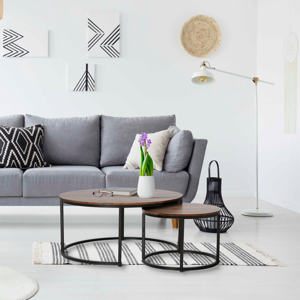 Materiál: DTD laminovaná/kov Barva: černá/ořech Větší stolek (průměr x V): 80x48 cm Menší stolek (průměr x V): 48x42 cm Tloušťka materiálu: 1,5 cm Nosnost: 40 kg Set dvou stolků Možnost zasunutí menšího pod větší stolek Kulatý Moderní Dodáváno v demontu