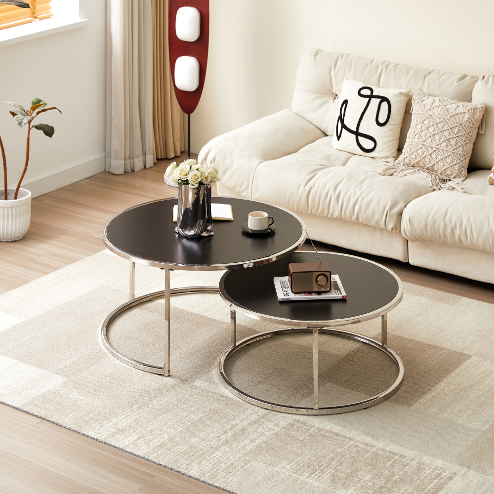 Materiál: ocel/MDF plát Barva: stříbrná/černá Větší stolek (průměr x V): 90x46 cm Menší stolek (průměr x V): 76x36 cm Tloušťka plátu stolu: 1,5 cm Set dvou stolků Originální kousek Kulatý Moderní a stylový Možnost zasunutí menšího pod větší stolek Plát stolu je neodnímatelný Nosnost stolu: 30 kg S plastovými nožičkami/krytkami Dodáváno v demontu