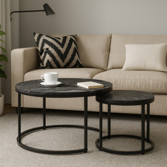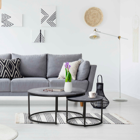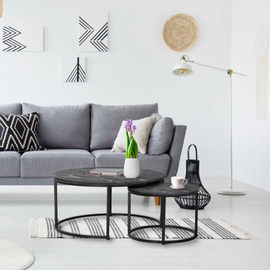 Materiál: DTD laminovaná/kov Barva: tmavě šedá/černá Větší stolek (průměr x V): 80x48 cm Menší stolek (průměr x V): 48x42 cm Tloušťka materiálu: 1,5 cm Nosnost: 40 kg Set dvou stolků Možnost zasunutí menšího pod větší stolek Kulatý Moderní Dodáváno v demontu