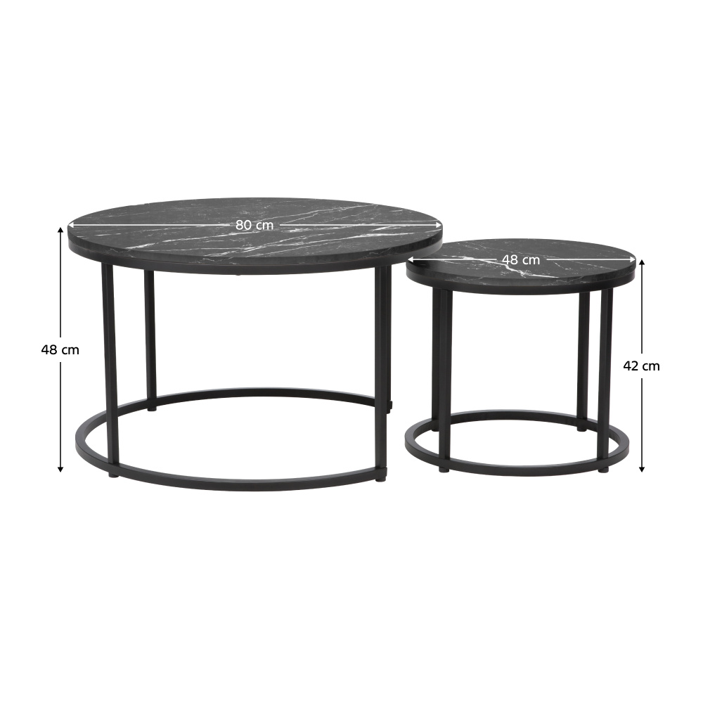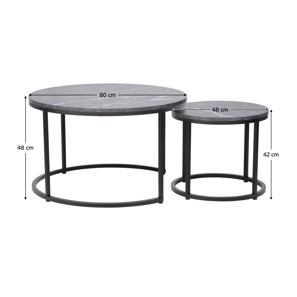 Materiál: DTD laminovaná/kov Barva: tmavě šedá/černá Větší stolek (průměr x V): 80x48 cm Menší stolek (průměr x V): 48x42 cm Tloušťka materiálu: 1,5 cm Nosnost: 40 kg Set dvou stolků Možnost zasunutí menšího pod větší stolek Kulatý Moderní Dodáváno v demontu