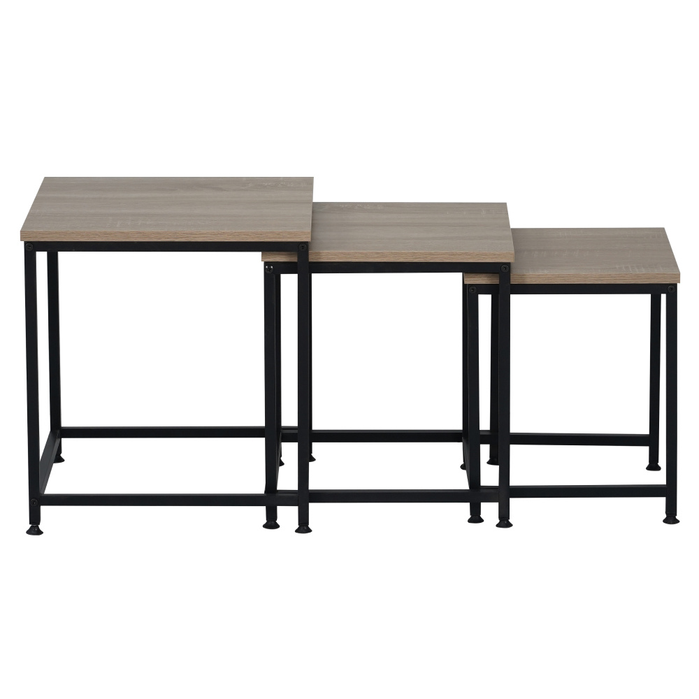 Materiál: MDF laminovaná/kov Barva: dub sonoma/černá Větší stolek (ŠxHxV): 40x40x42 cm Střední stolek (ŠxHxV): 35x35x39 cm Menší stolek (ŠxHxV): 30x30x36 cm Tloušťka materiálu: 1,5 cm Set 3 kusů Možnost zasunutí menších stolků pod větší Moderní a stylový Nosnost: 30 kg Dodáváno v demontu