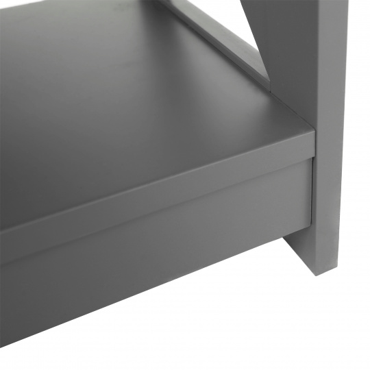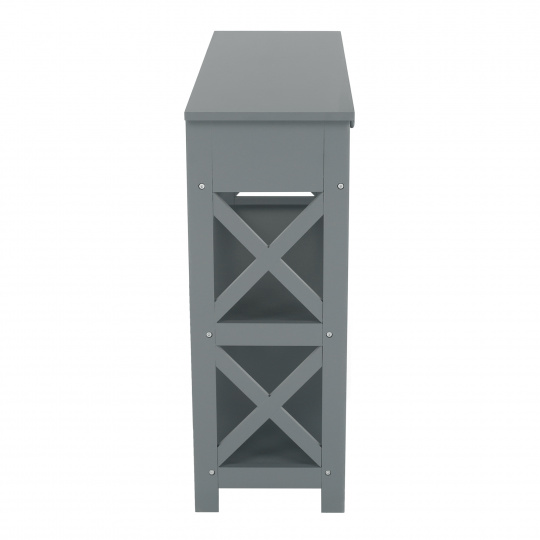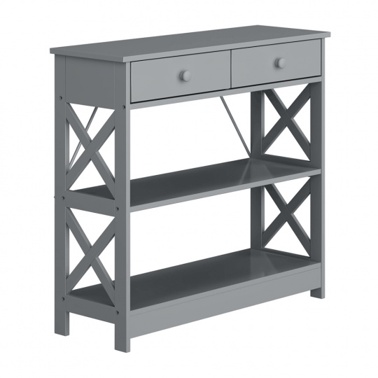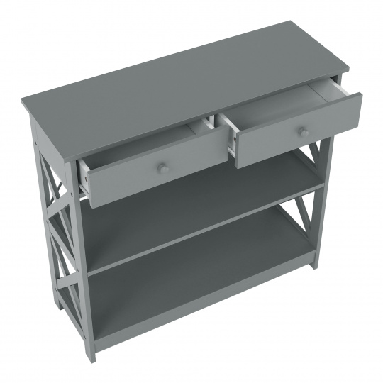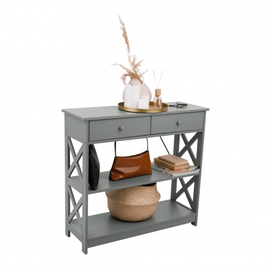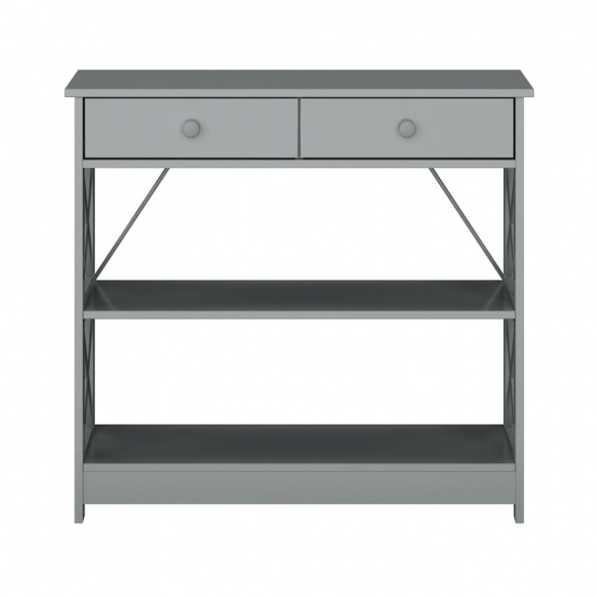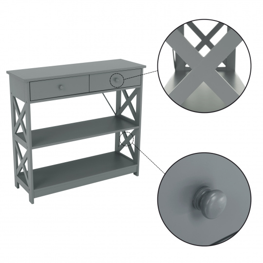 Materiál: lakovaná MDF Barva: šedá Rozměry (ŠxHxV): 86,6x30x80 cm Vnější rozměr šuplíku (ŠxHxV): 39,5x29x11 cm Vnitřní rozměr šuplíku (ŠxHxV): 24,4x23,7x7 cm Tloušťka šuplíků: 12 mm Tloušťka konstrukce: 15 mm Výška mezi policemi: 27,5 cm Výška od země po vrch spodní poličky: 10 cm Výška od země po spodní část poličky: 5,5 cm Nosnost: 35 kg Se dvěma policemi Obsahuje 2 zásuvky s dřevěnými úchytkami Nosnost poliček: 7 kg konzolový stolek Dodávané v demontu