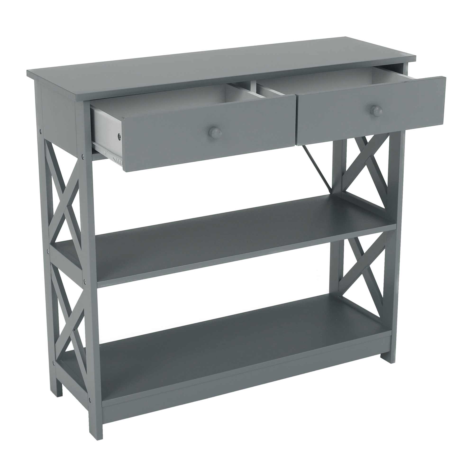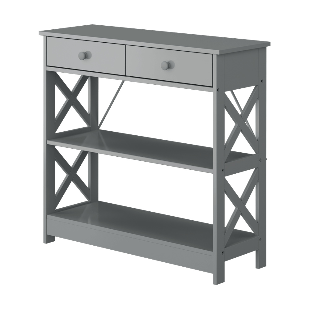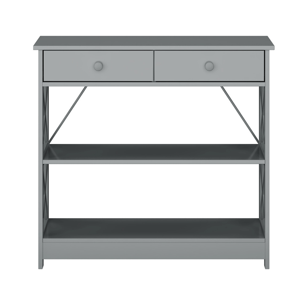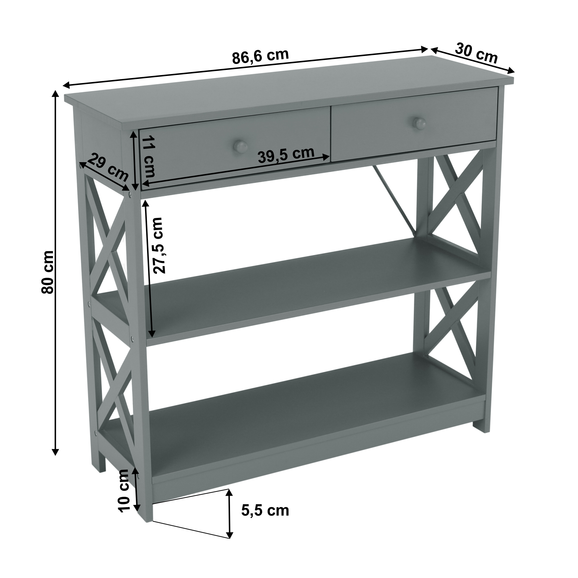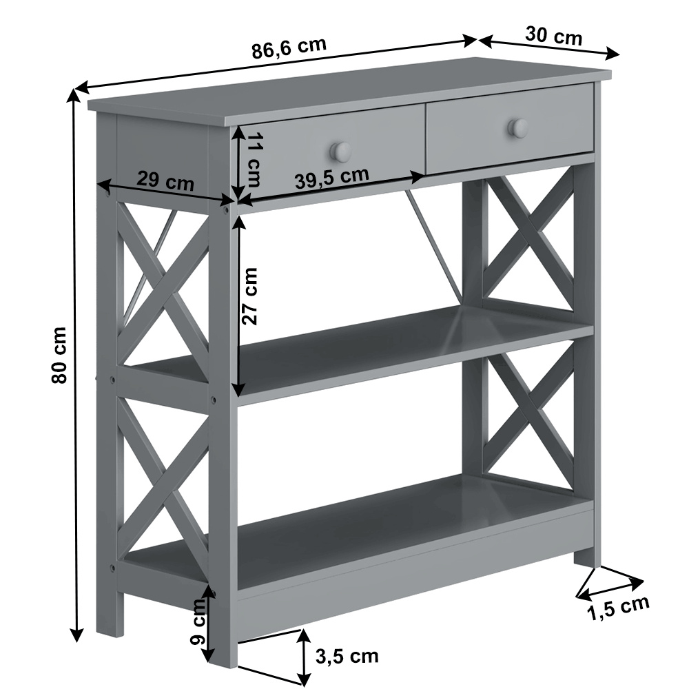 Materiál: lakovaná MDF Barva: šedá Rozměry (ŠxHxV): 86,6x30x80 cm Vnější rozměr šuplíku (ŠxHxV): 39,5x29x11 cm Vnitřní rozměr šuplíku (ŠxHxV): 24,4x23,7x7 cm Tloušťka šuplíků: 12 mm Tloušťka konstrukce: 15 mm Výška mezi policemi: 27,5 cm Výška od země po vrch spodní poličky: 10 cm Výška od země po spodní část poličky: 5,5 cm Nosnost: 35 kg Se dvěma policemi Obsahuje 2 zásuvky s dřevěnými úchytkami Nosnost poliček: 7 kg konzolový stolek Dodávané v demontu