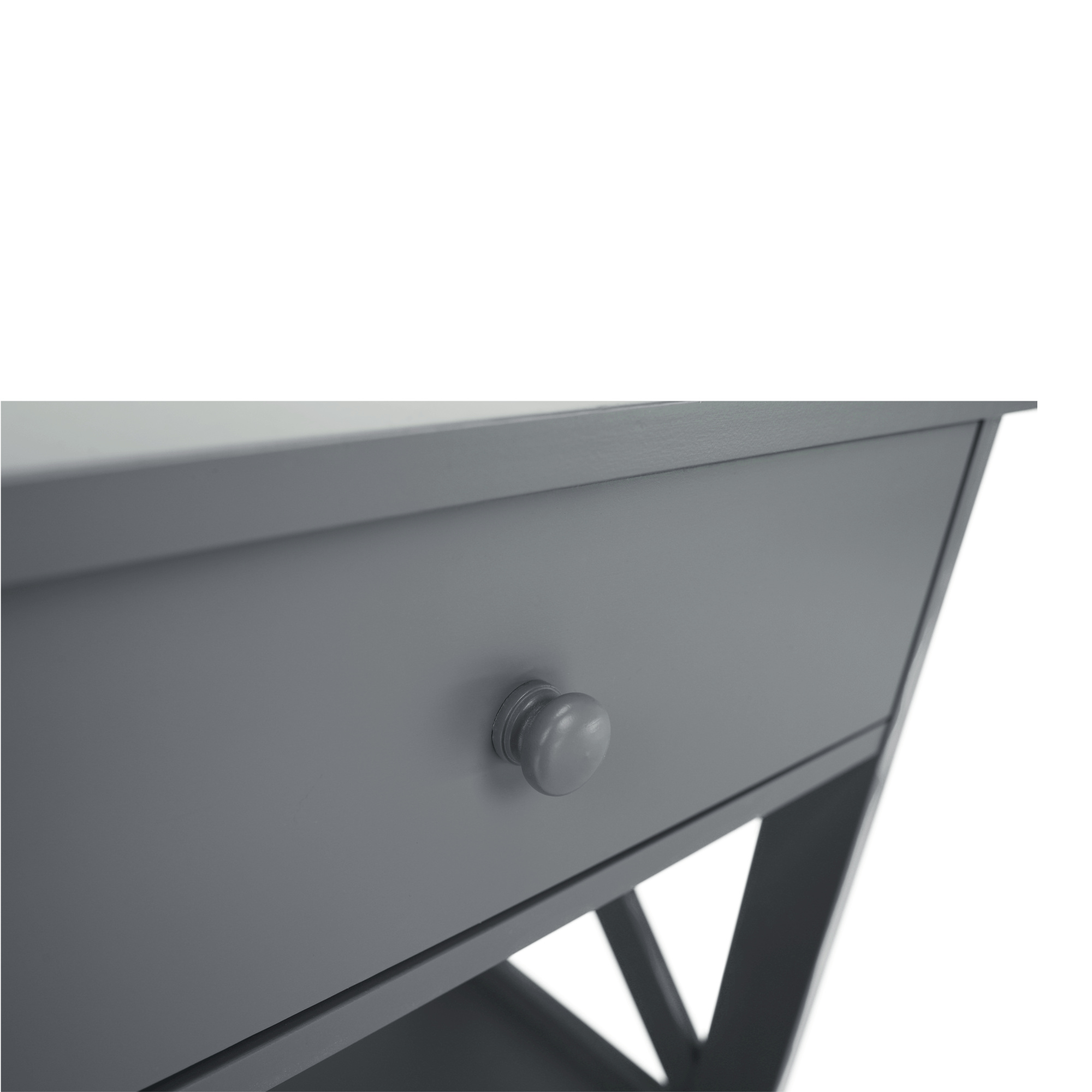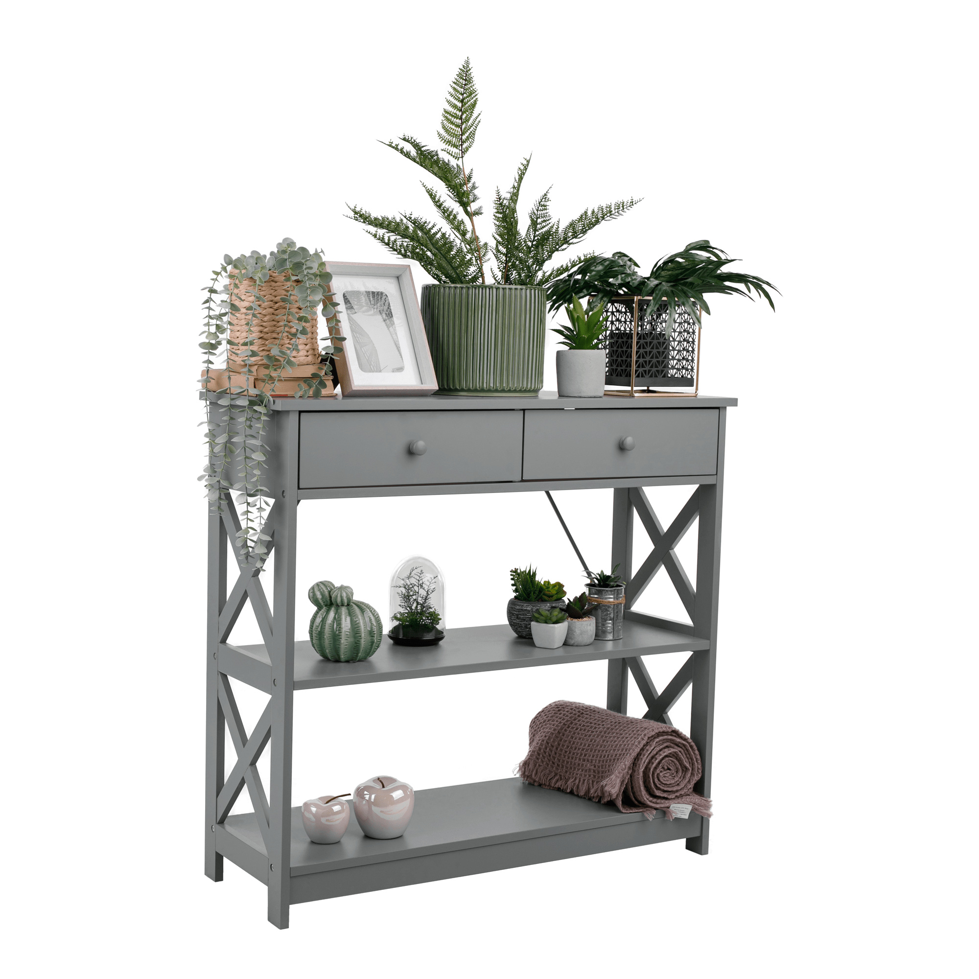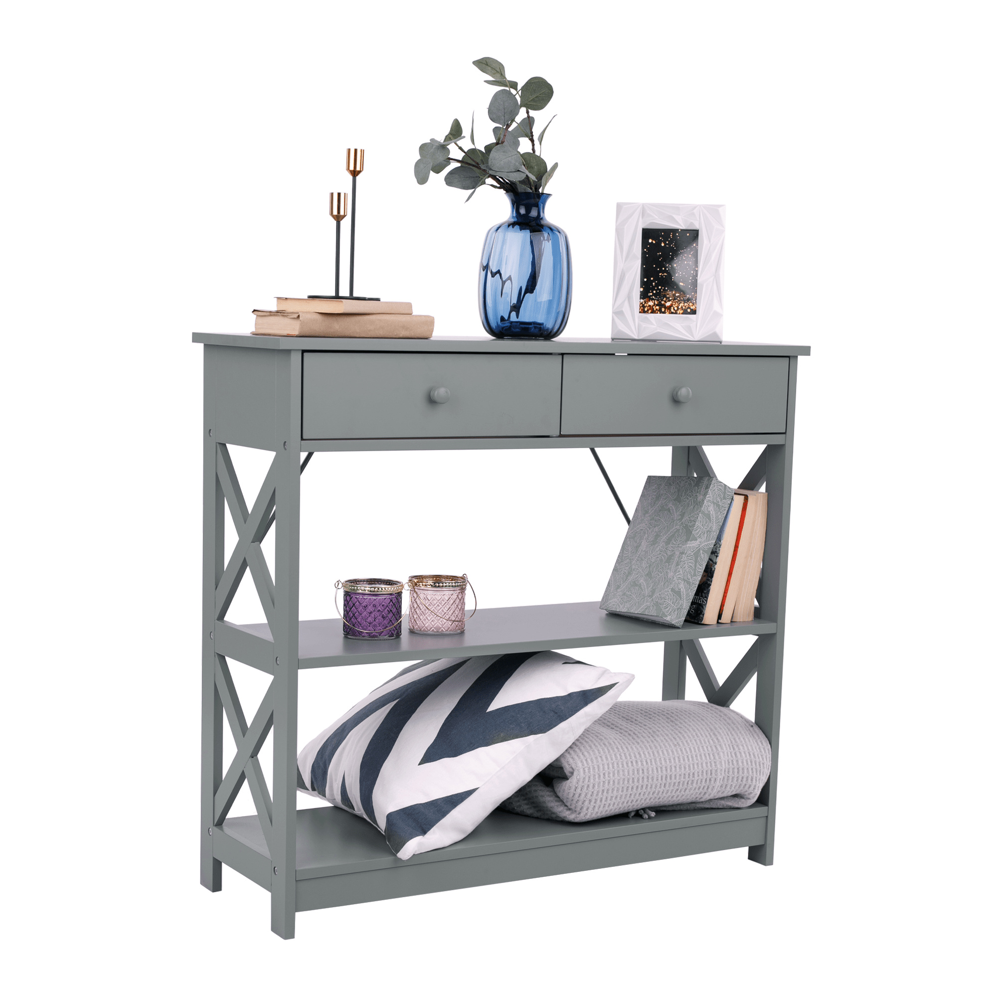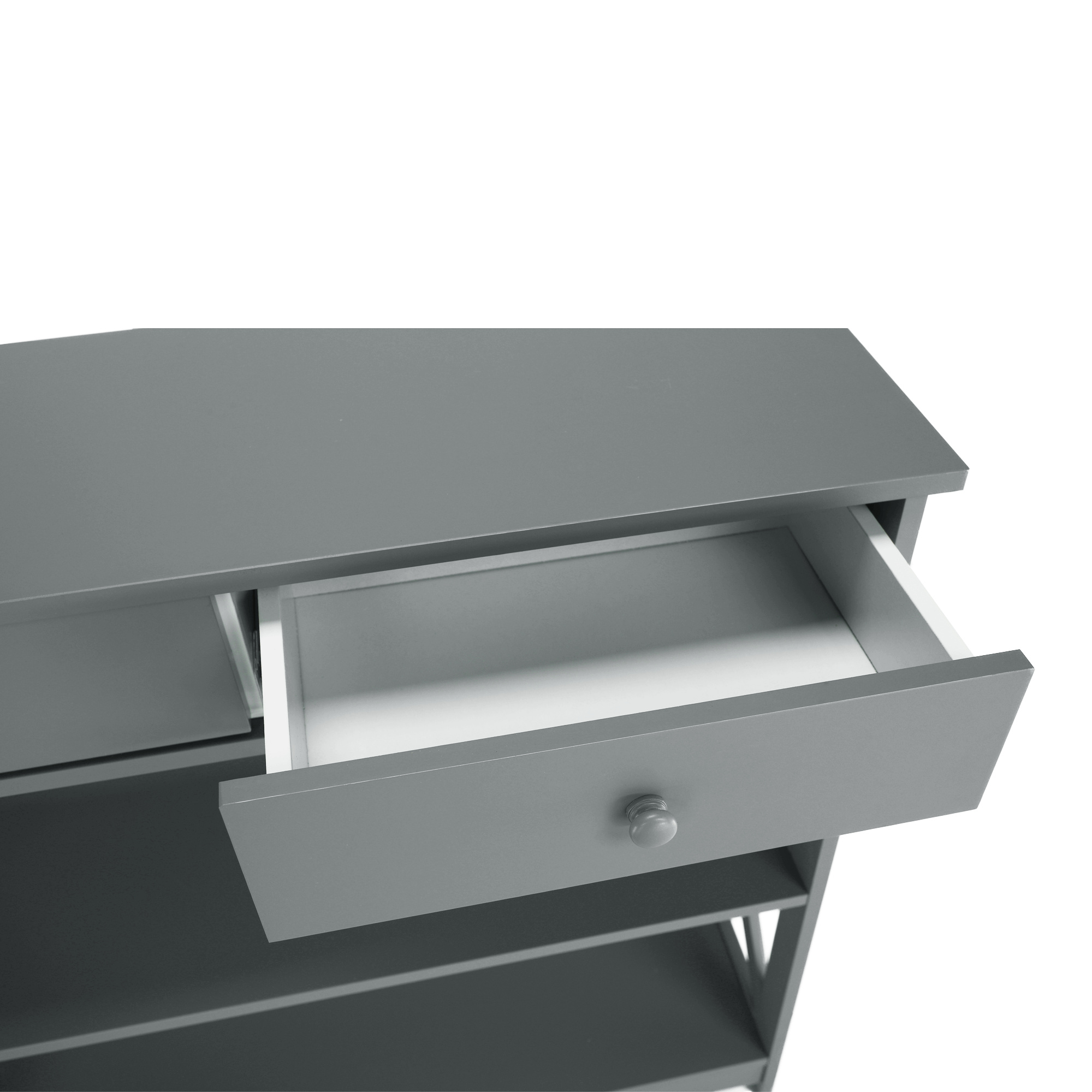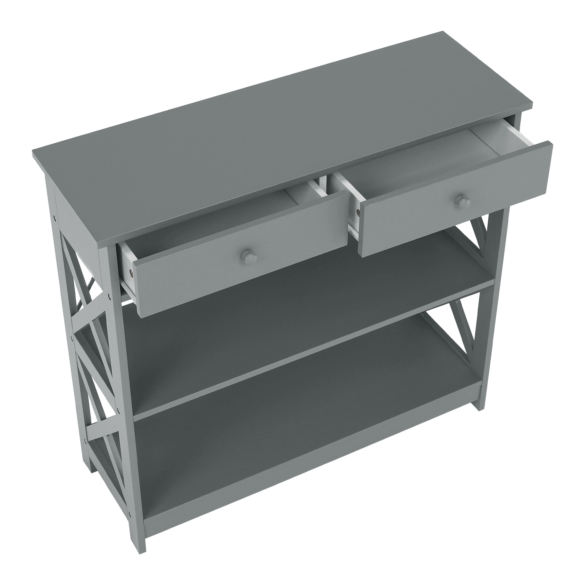 Materiál: lakovaná MDF Barva: šedá Rozměry (ŠxHxV): 86,6x30x80 cm Vnější rozměr šuplíku (ŠxHxV): 39,5x29x11 cm Vnitřní rozměr šuplíku (ŠxHxV): 24,4x23,7x7 cm Tloušťka šuplíků: 12 mm Tloušťka konstrukce: 15 mm Výška mezi policemi: 27,5 cm Výška od země po vrch spodní poličky: 10 cm Výška od země po spodní část poličky: 5,5 cm Nosnost: 35 kg Se dvěma policemi Obsahuje 2 zásuvky s dřevěnými úchytkami Nosnost poliček: 7 kg konzolový stolek Dodávané v demontu