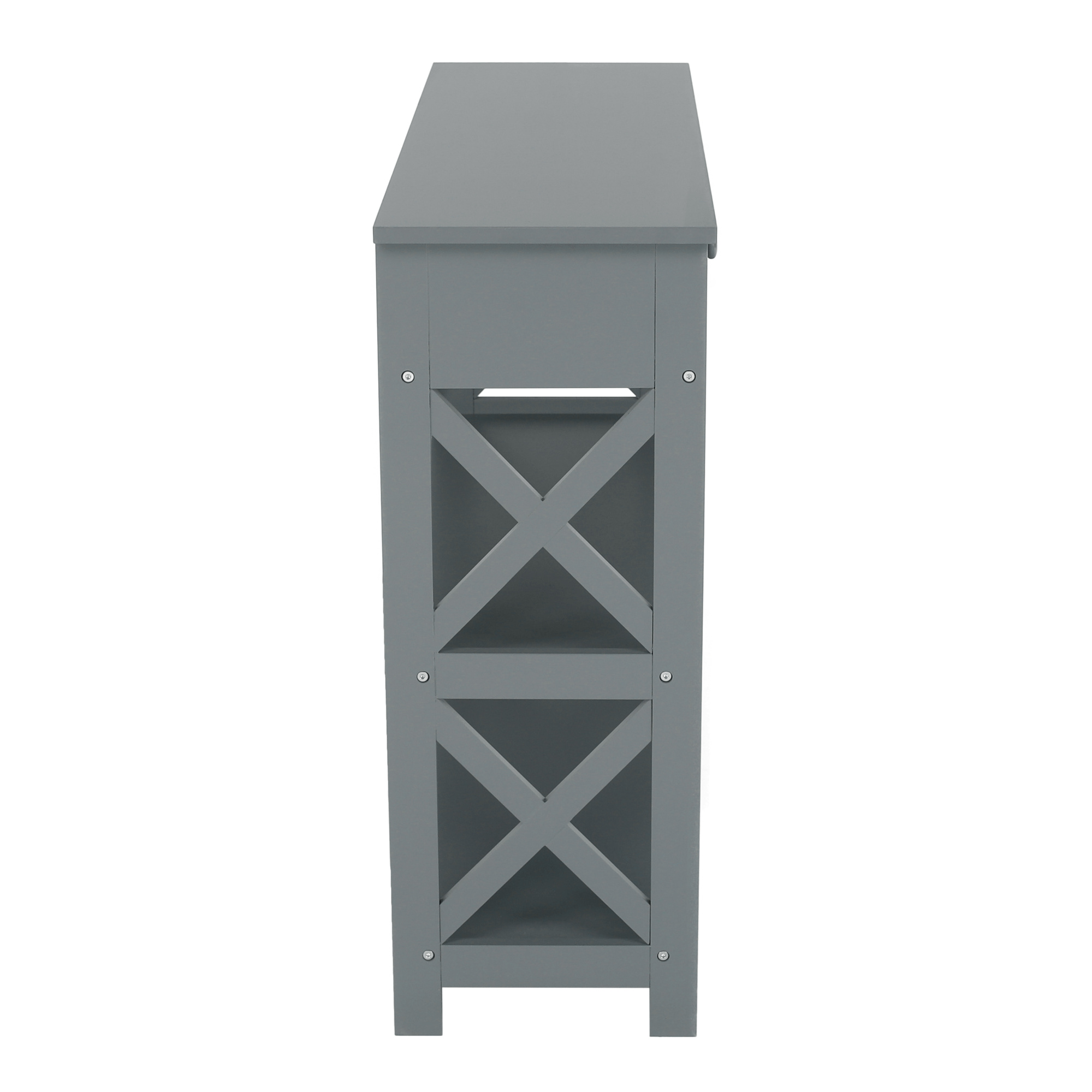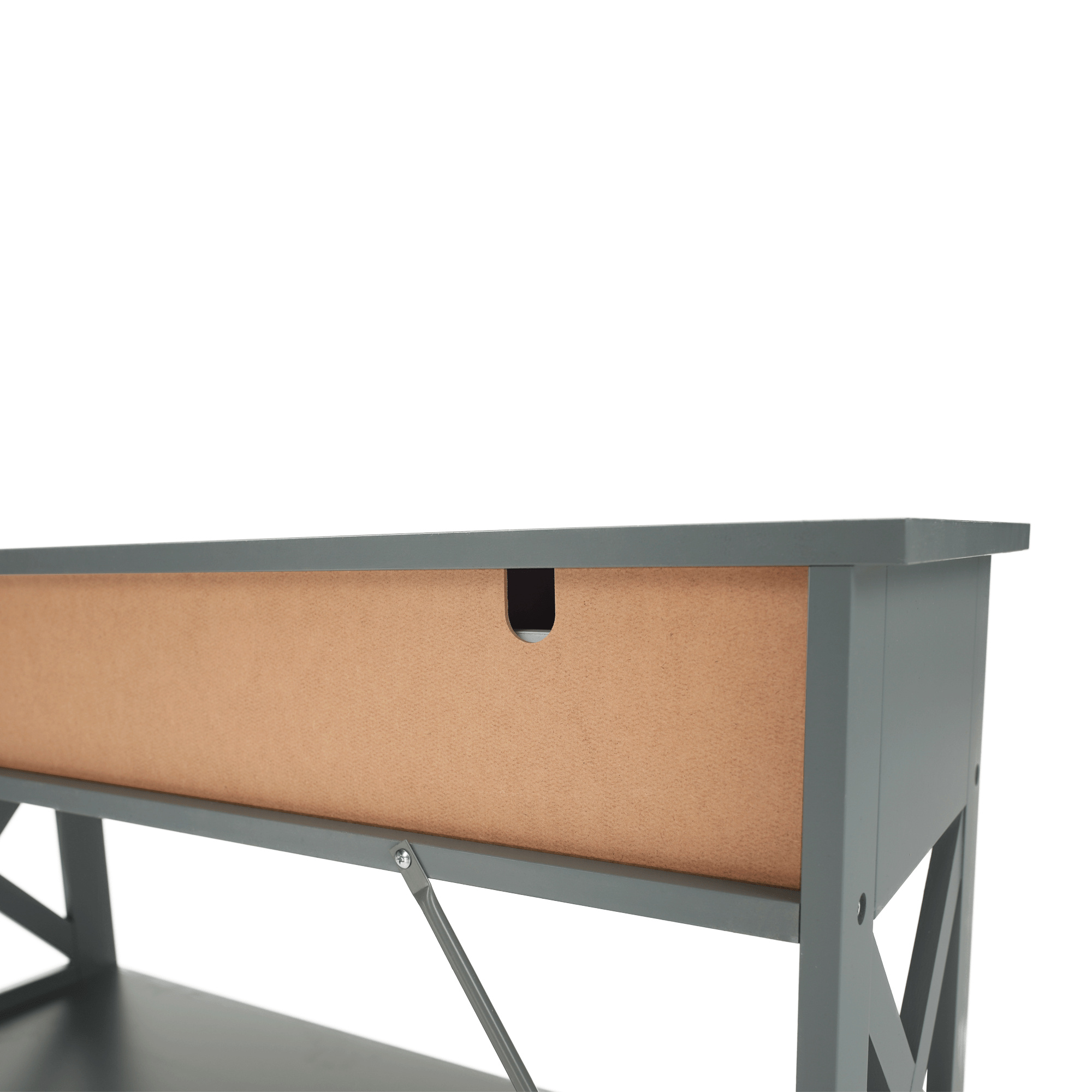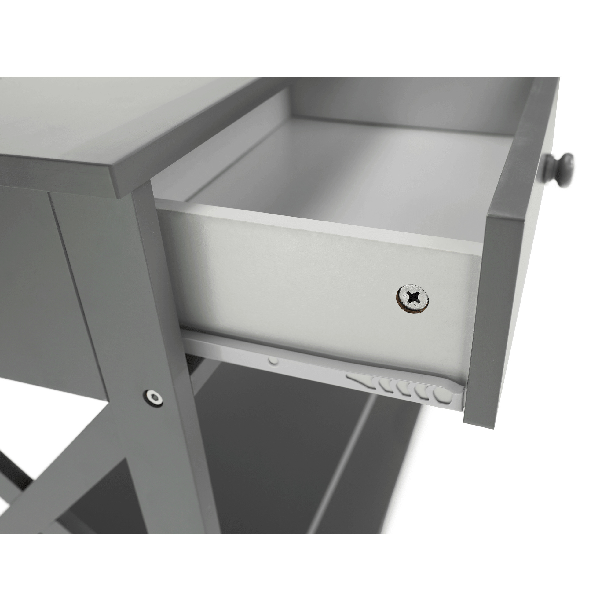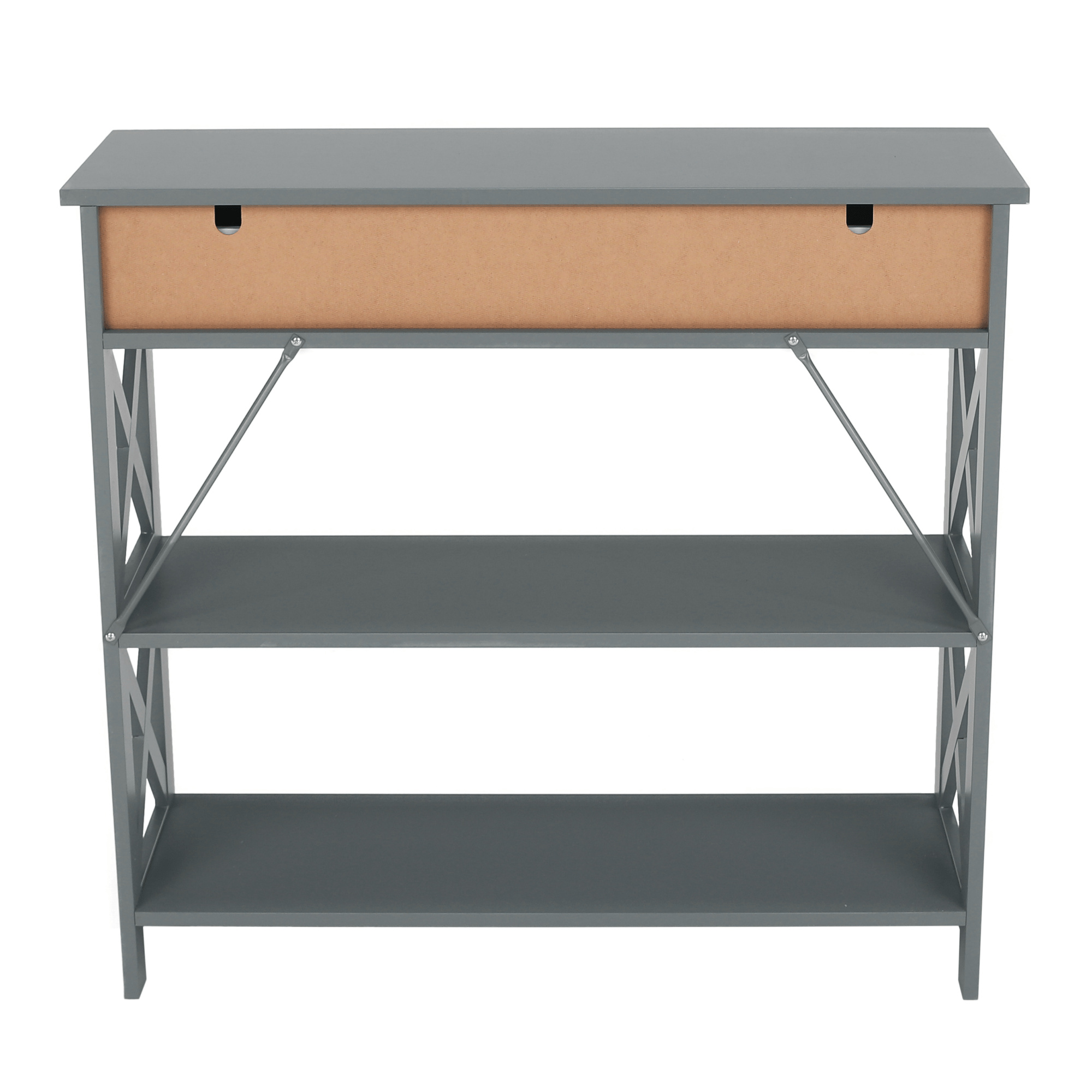 Materiál: lakovaná MDF Barva: šedá Rozměry (ŠxHxV): 86,6x30x80 cm Vnější rozměr šuplíku (ŠxHxV): 39,5x29x11 cm Vnitřní rozměr šuplíku (ŠxHxV): 24,4x23,7x7 cm Tloušťka šuplíků: 12 mm Tloušťka konstrukce: 15 mm Výška mezi policemi: 27,5 cm Výška od země po vrch spodní poličky: 10 cm Výška od země po spodní část poličky: 5,5 cm Nosnost: 35 kg Se dvěma policemi Obsahuje 2 zásuvky s dřevěnými úchytkami Nosnost poliček: 7 kg konzolový stolek Dodávané v demontu