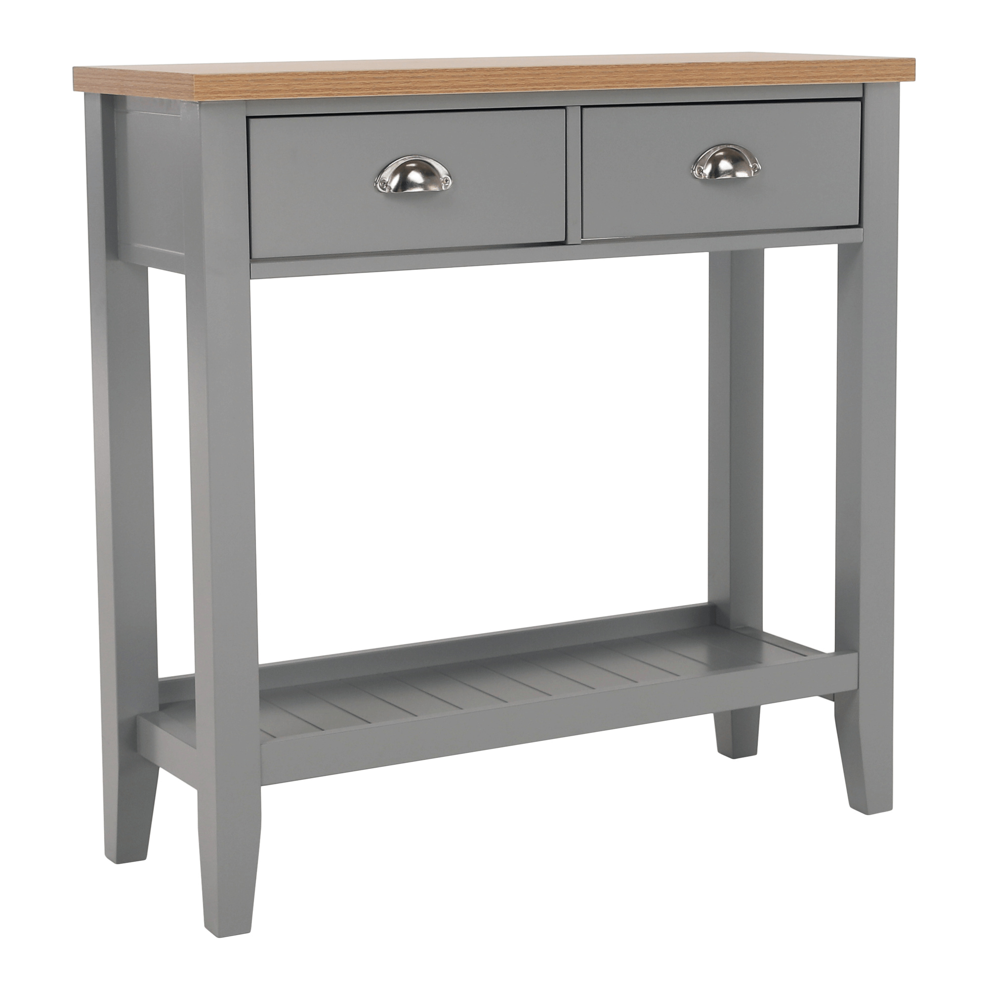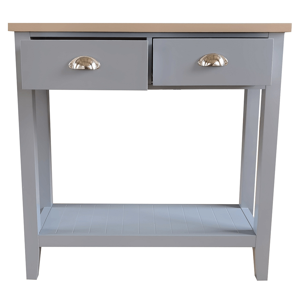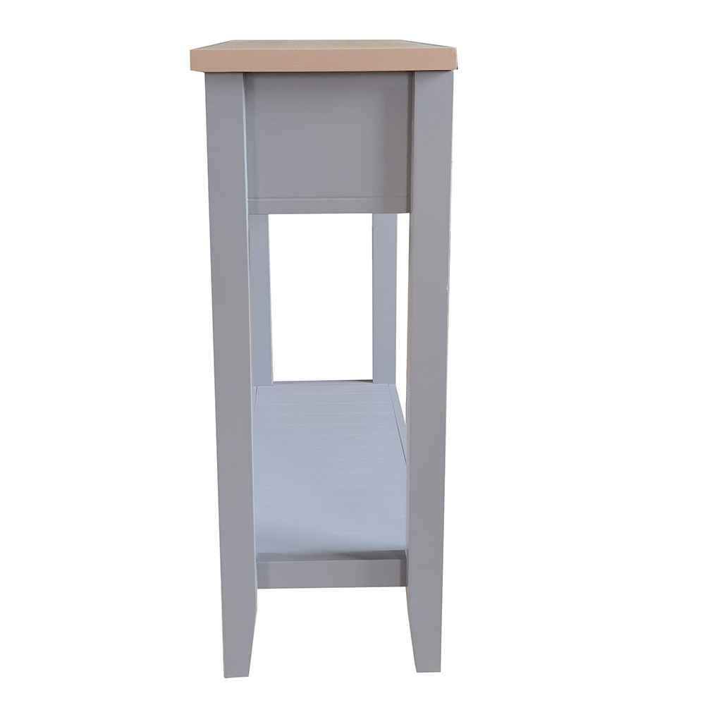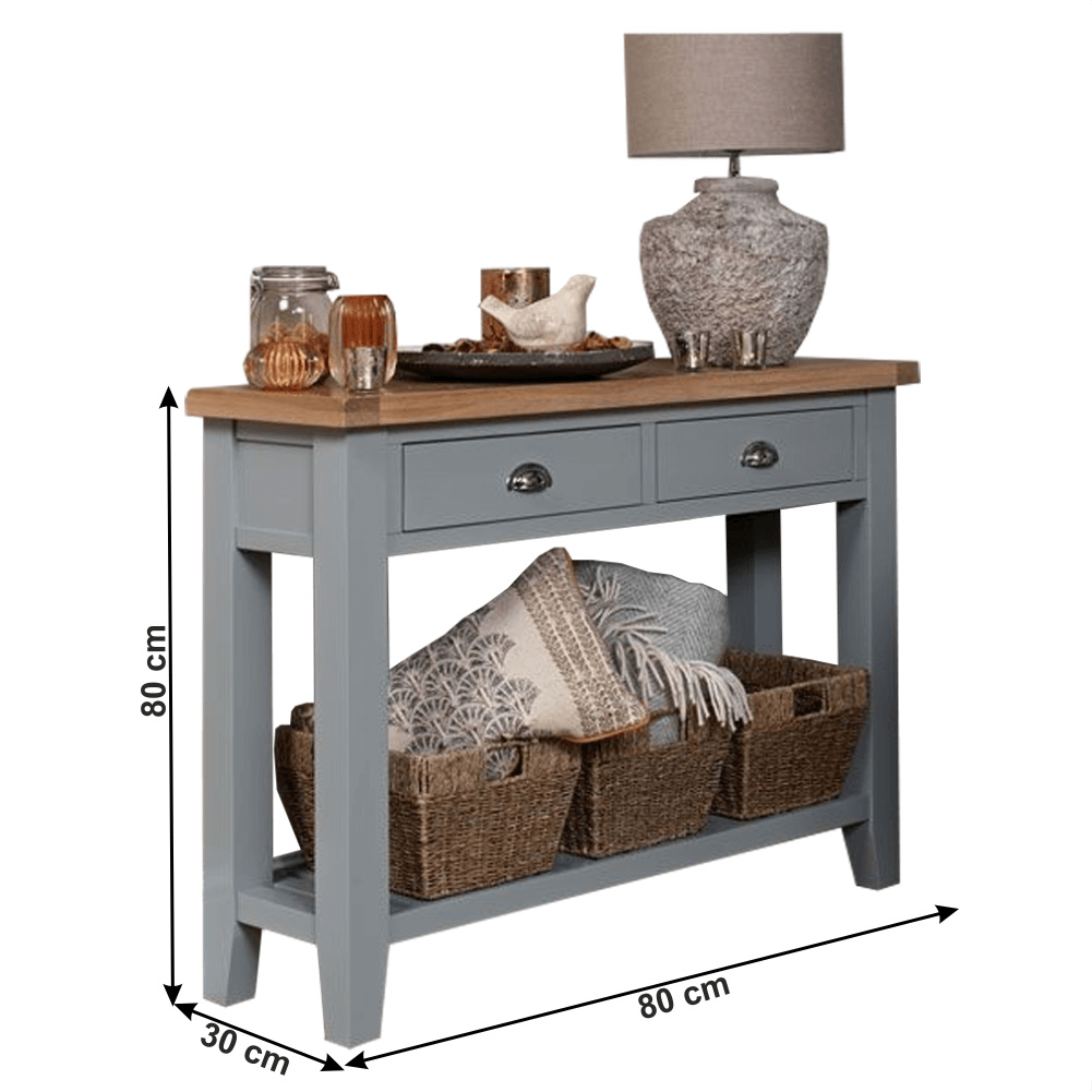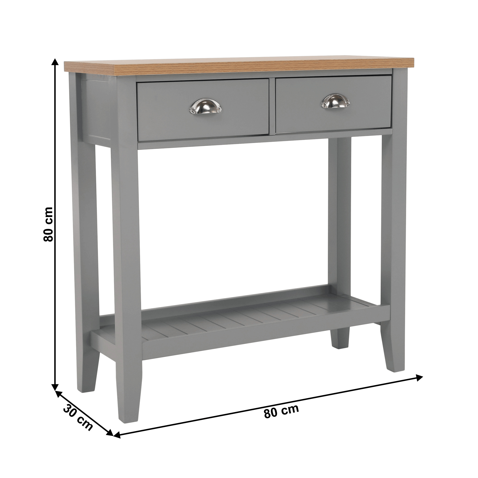 Materiál: MDF / DTD laminovaná Tloušťka materiálu: 25 mm Barva: šedá / světlý ořech Rozměry (ŠxHxV): 80x30x80 cm dva šuplíky S policí konzola konzolový stolek Dodávané v demontu.