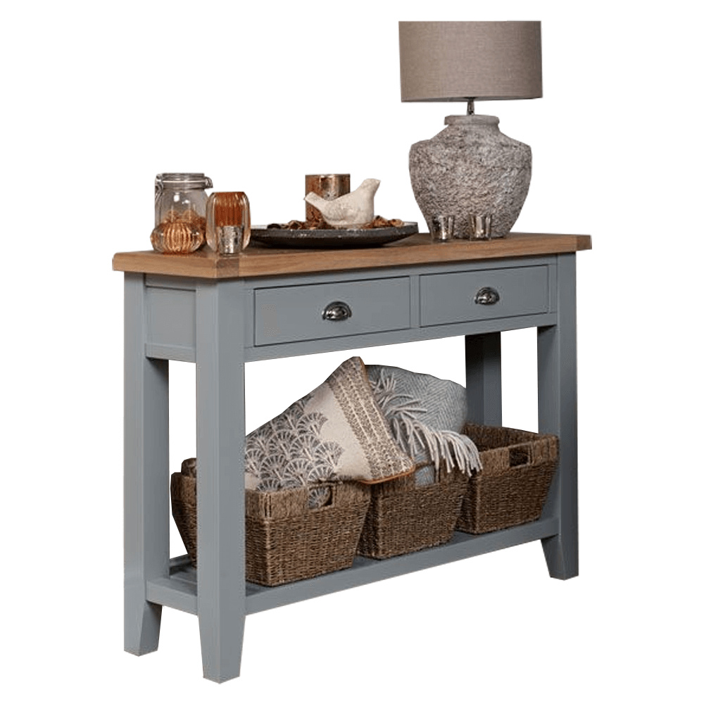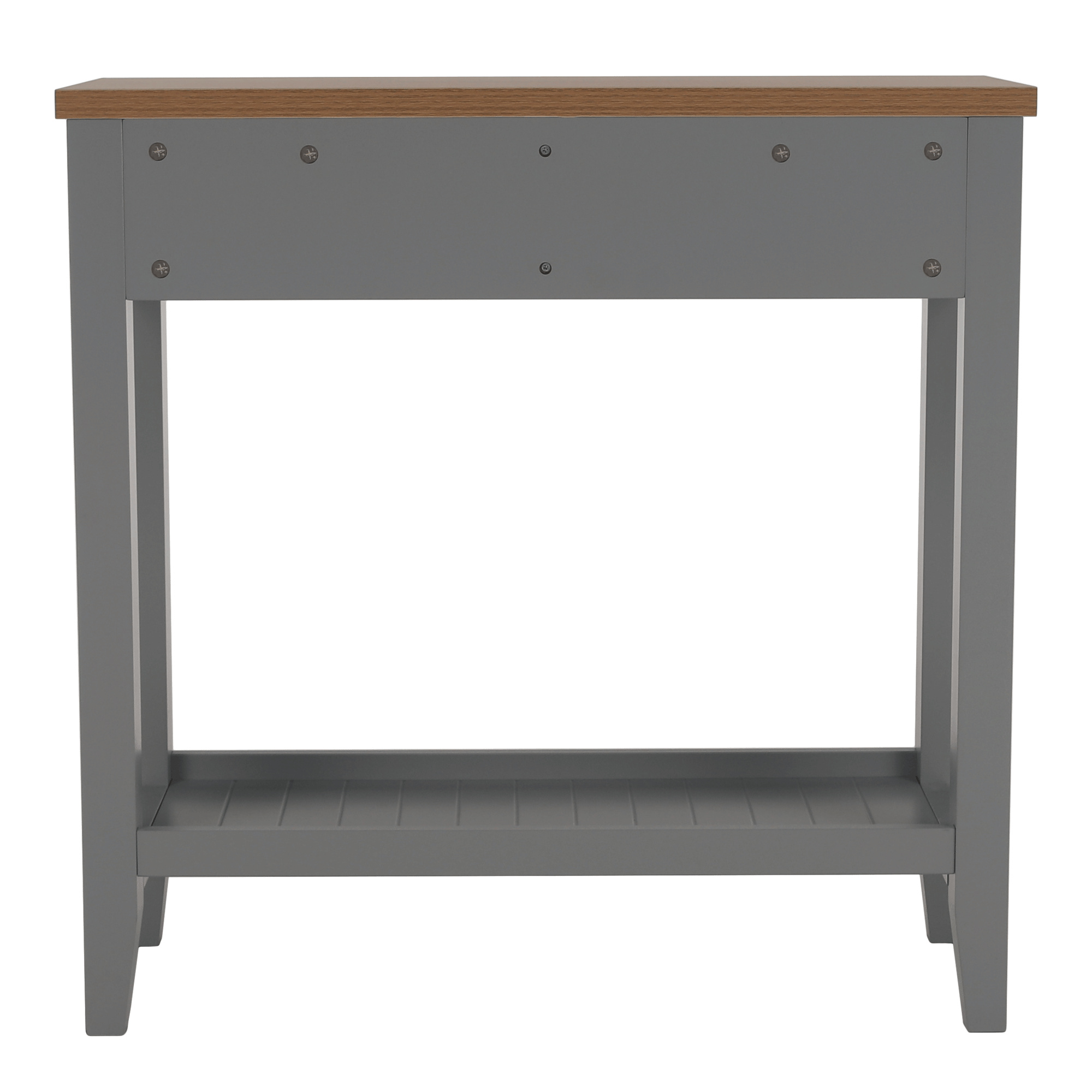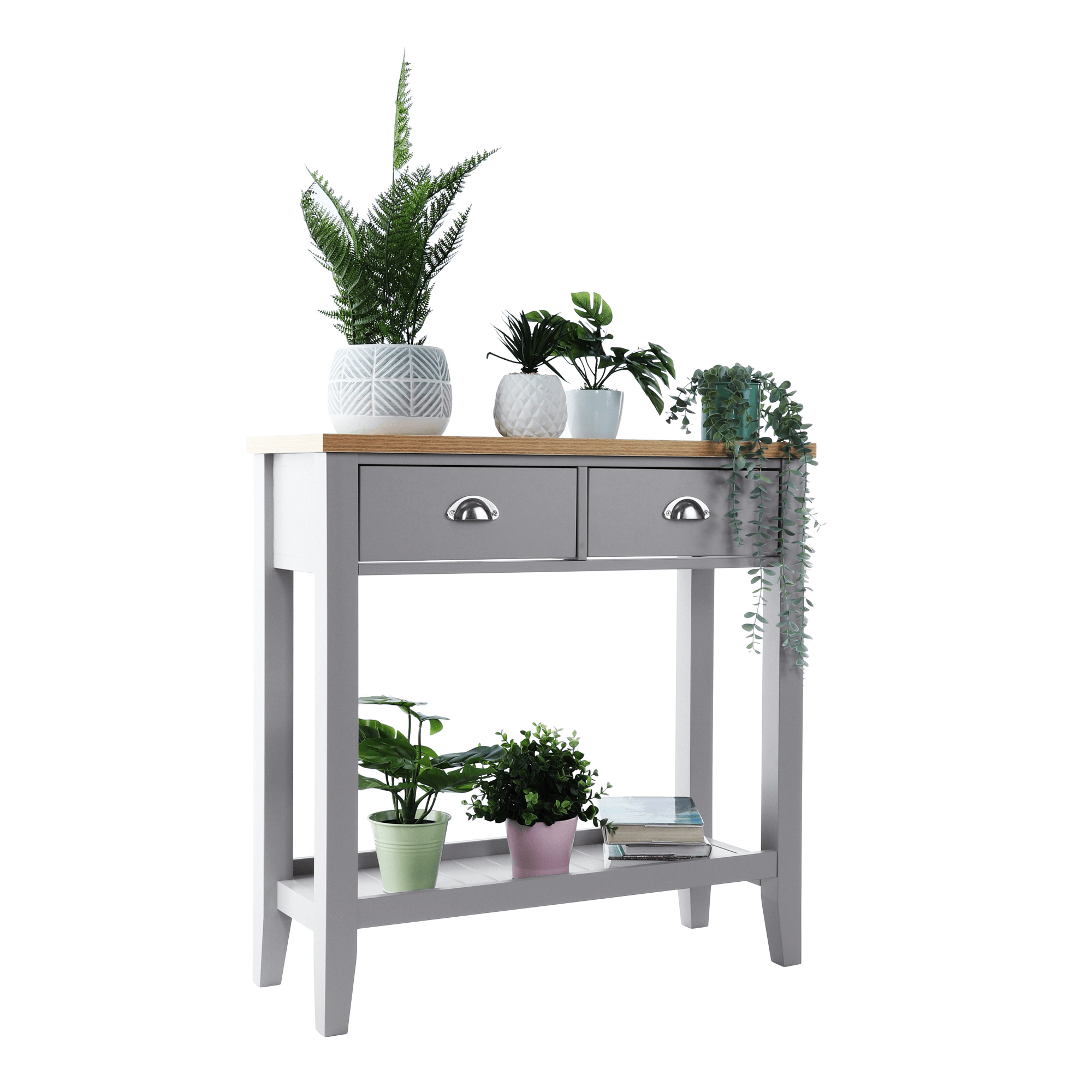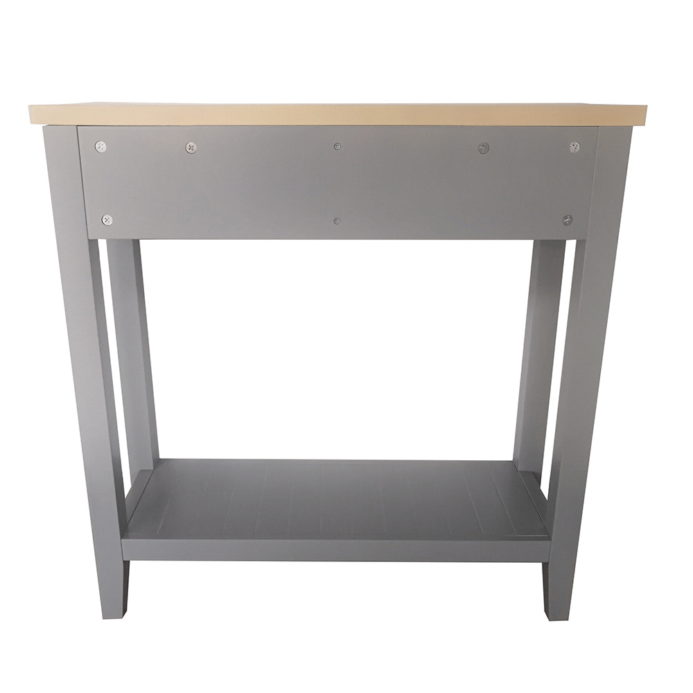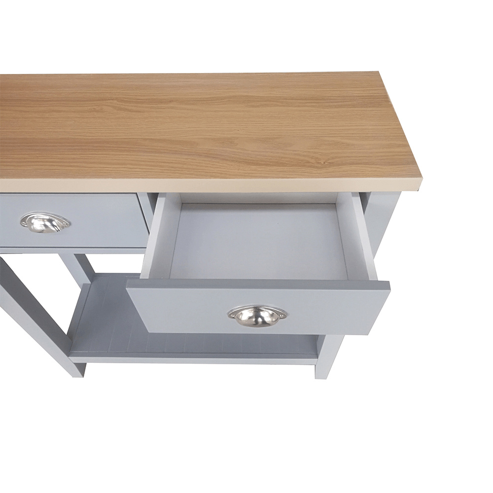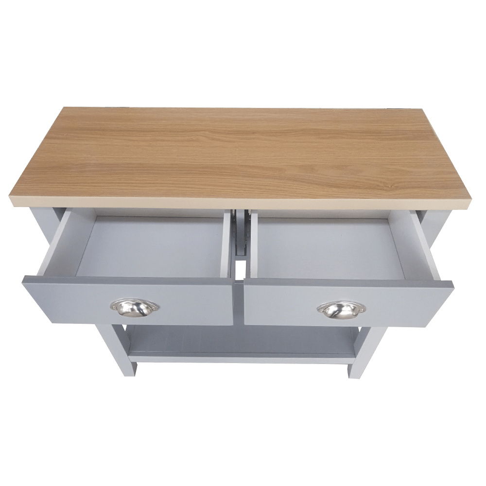 Materiál: MDF / DTD laminovaná Tloušťka materiálu: 25 mm Barva: šedá / světlý ořech Rozměry (ŠxHxV): 80x30x80 cm dva šuplíky S policí konzola konzolový stolek Dodávané v demontu.