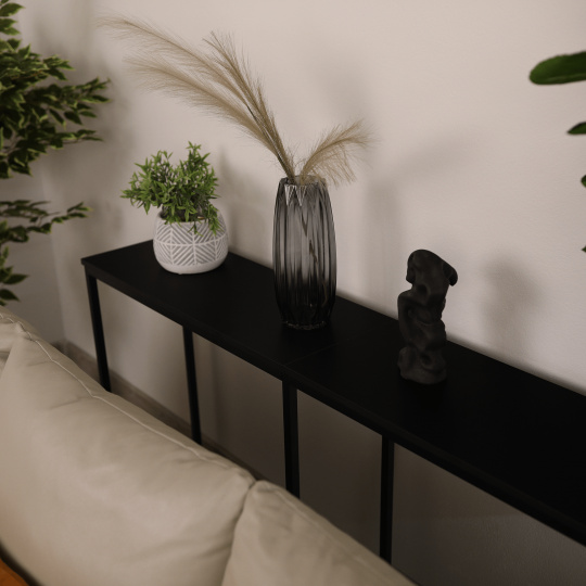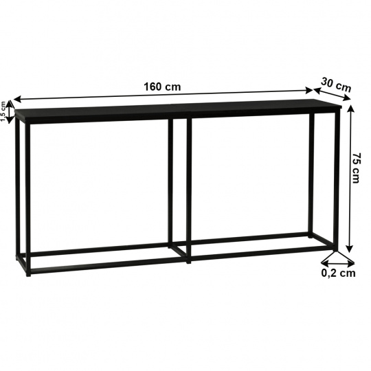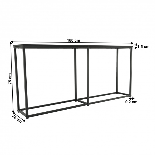 Materiál konstrukce: ocel Barva konstrukce: černá Materiál desky: DTD fóliovaná Tloušťka materiálu: 15 mm Barva desky: tmavě šedá grafit Rozměry (ŠxHxV): 160x30x75 cm industriální styl příruční odkládací Jednoduché a univerzální provedení estetický vzhled funkční multifunkční využití Hmotnost: 10,3 kg Nosnost: 20 kg Dodávané v demontu.