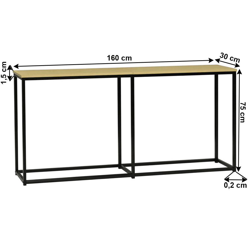 Materiál konstrukce: ocel Barva konstrukce: černá Materiál desky: DTD fóliovaná Barva desky: dub Rozměry (ŠxHxV): 160x30x75 cm industriální styl příruční odkládací Jednoduché a univerzální provedení estetický vzhled funkční multifunkční využití Hmotnost: 10,3 kg Nosnost: 20 kg Dodávané v demontu.