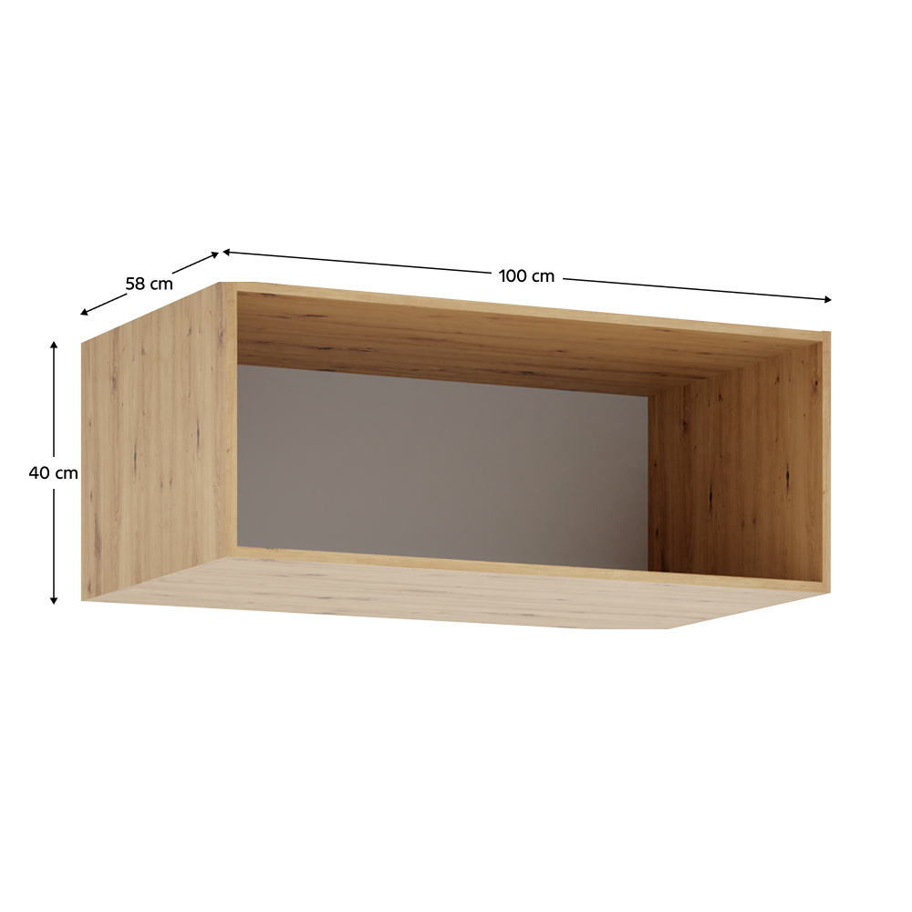 Materiál: laminovaná DTD/ABS hrany Barva: dub artisan Rozměry (ŠxHxV): 100x58x40 cm Tloušťka materiálu DTD: 1,6 cm Tloušťka materiálu ABS: 0,045 cm Nosnost: 5 kg Otevřený Možnost kombinovat s odstínem kašmír Dodáváno bez skříně Doporučujeme zakoupit ke korpusu KREO 100 Dodáváno bez dvířek Možnost doplnit o dvě vysoká dvířka KREO Předvrtané otvory pro montáž pantů dvířek na obou stranách Doporučujeme připevnit ke zdi Dodáváno v demontu