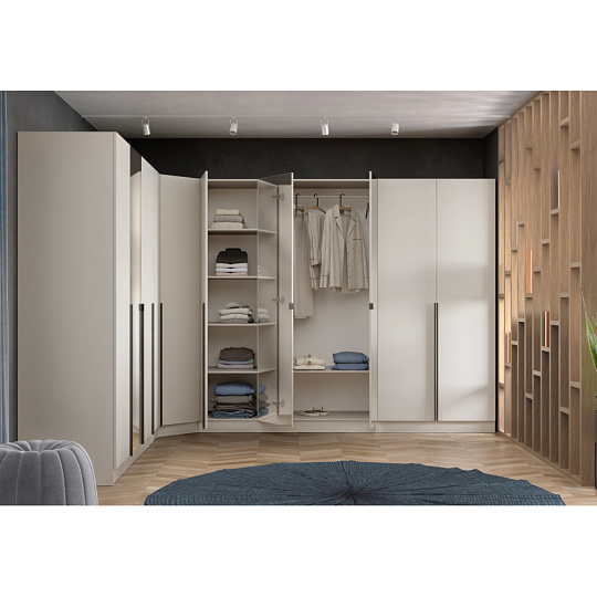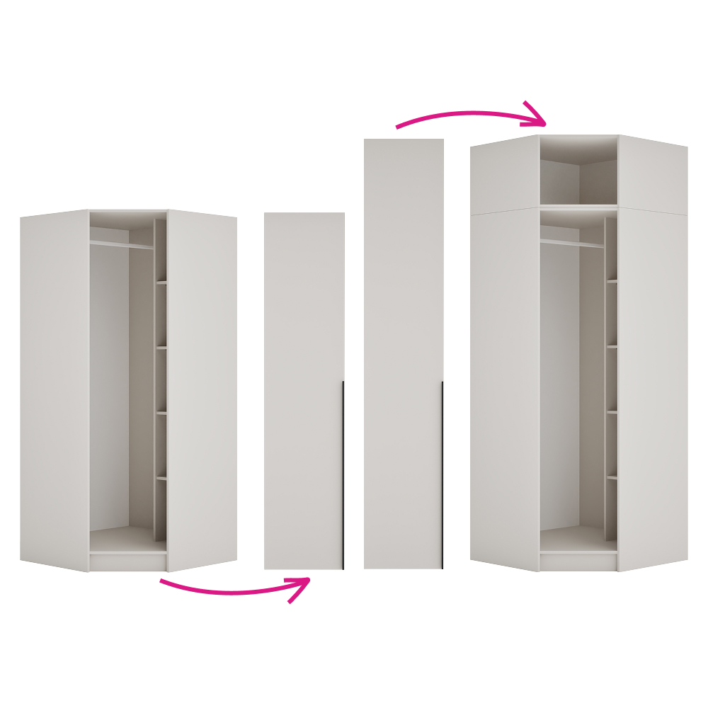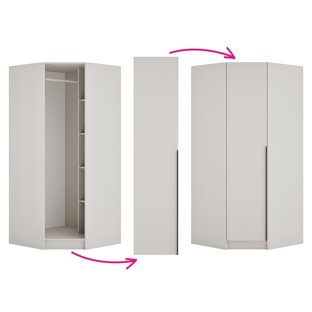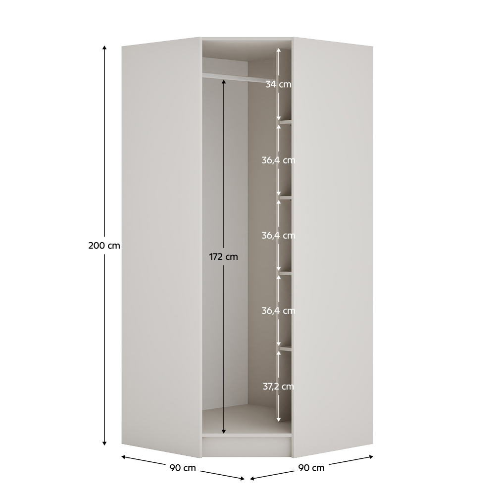 Materiál: laminovaná DTD/ABS hrany Barva: kašmír Rozměry (ŠxHxV): 90x90x200 cm Tloušťka materiálu DTD: 1,6 cm Tloušťka materiálu ABS: 0,045 cm Otevřená skříň Rohová Policová Nosnost police: 5 kg Věšáková tyč Nosnost věšákové tyče: 5 kg Možnost kombinovat s odstínem dub artisan Dodáváno bez dvířek Možnost doplnit o nízká rohová dvířka KREO Předvrtané otvory pro montáž pantů dvířek na obou stranách Doporučujeme připevnit ke zdi Dodáváno v demontu