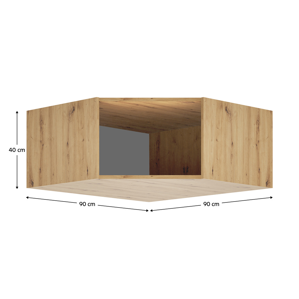 Materiál: laminovaná DTD/ABS hrany Barva: dub artisan Rozměry (ŠxHxV): 90x90x40 cm Tloušťka materiálu DTD: 1,6 cm Tloušťka materiálu ABS: 0,045 cm Nosnost: 5 kg Otevřený Rohový Možnost kombinovat s odstínem dub artisan Dodáváno bez skříně Doporučujeme zakoupit ke rohovému korpusu KREO Dodáváno bez dvířek Možnost doplnit o vysoká rohová dvířka KREO Předvrtané otvory pro montáž pantů dvířek na obou stranách Doporučujeme připevnit ke zdi Dodáváno v demontu