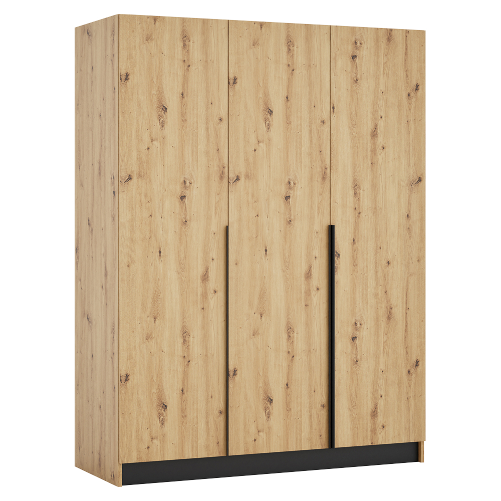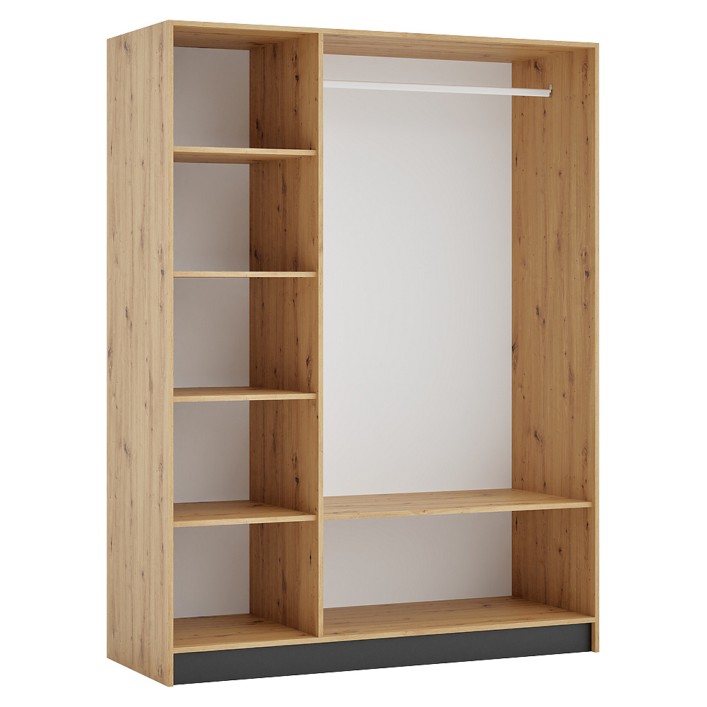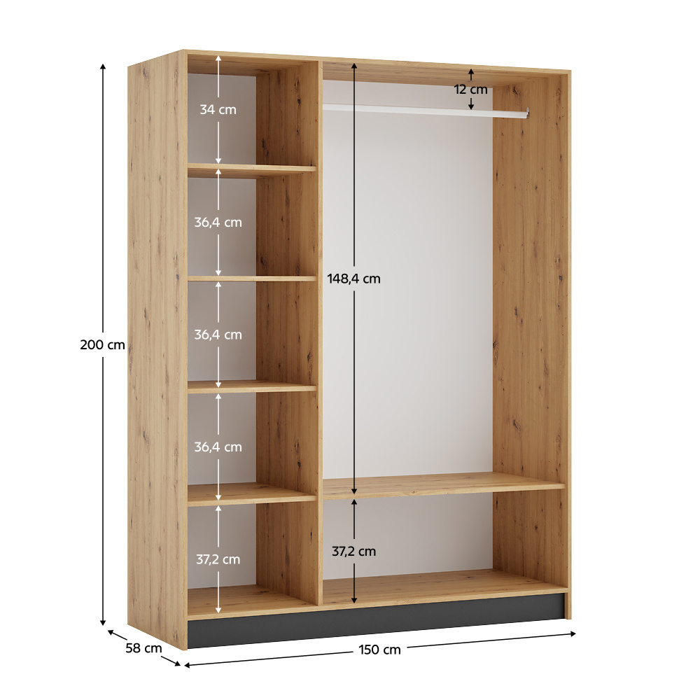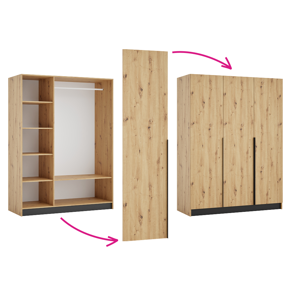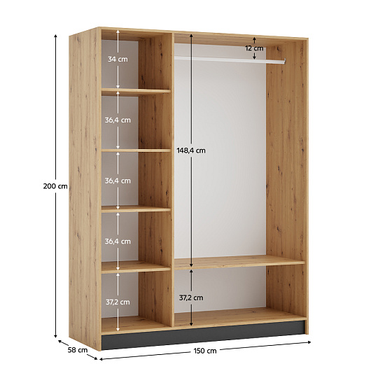Materiál: laminovaná DTD/ABS hrany Barva: dub artisan/černá Rozměry (ŠxHxV): 150x58x200 cm Tloušťka materiálu DTD: 1,6 cm Tloušťka materiálu ABS: 0,045 cm Otevřená skříň Policová Nosnost police: 5 kg věšáková tyč Nosnost věšákové tyče: 5 kg Možnost kombinovat s odstínem kašmír Dodáváno bez dvířek Možnost doplnit o tři nízká dvířka KREO Předvrtané otvory pro montáž pantů dvířek na obou stranách Doporučujeme připevnit ke stěně Dodáváno v demontu