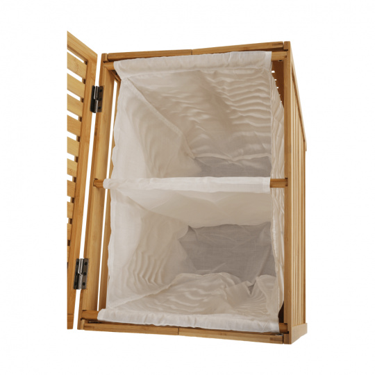 Materiál: bambus / látka Barva: přírodní Rozměry (ŠxHxV): 50x35x60 cm Vyjímatelný látkový pytel Látkové země mohou prát v pračce Objem: 105 litrů Skládací koš Odvětrávaný úložný prostor Úložný prostor rozdělený na dvě části Dodáváno v demontu