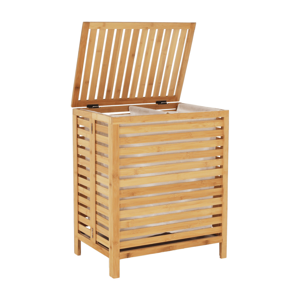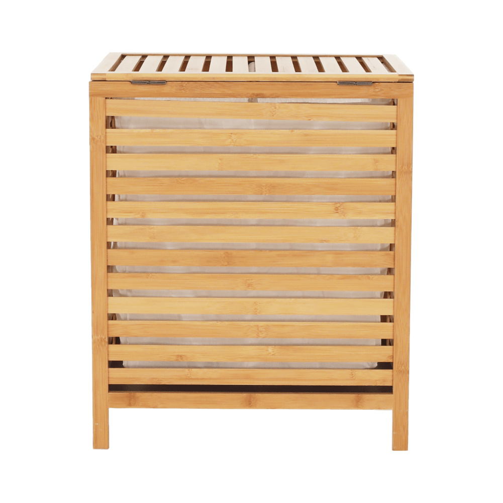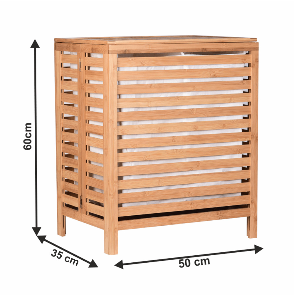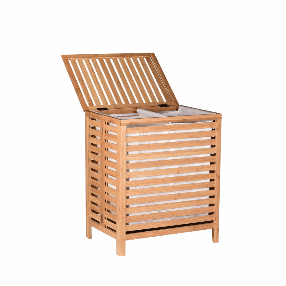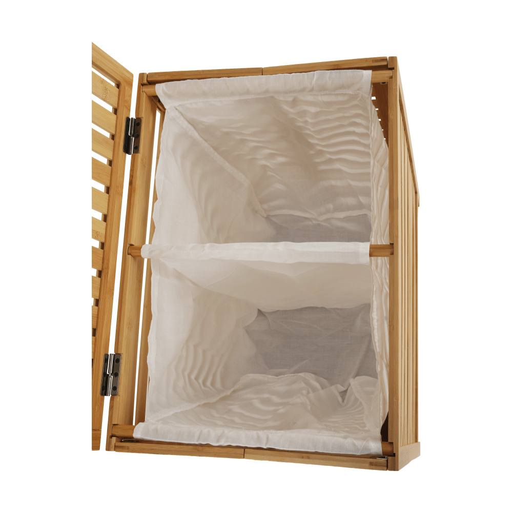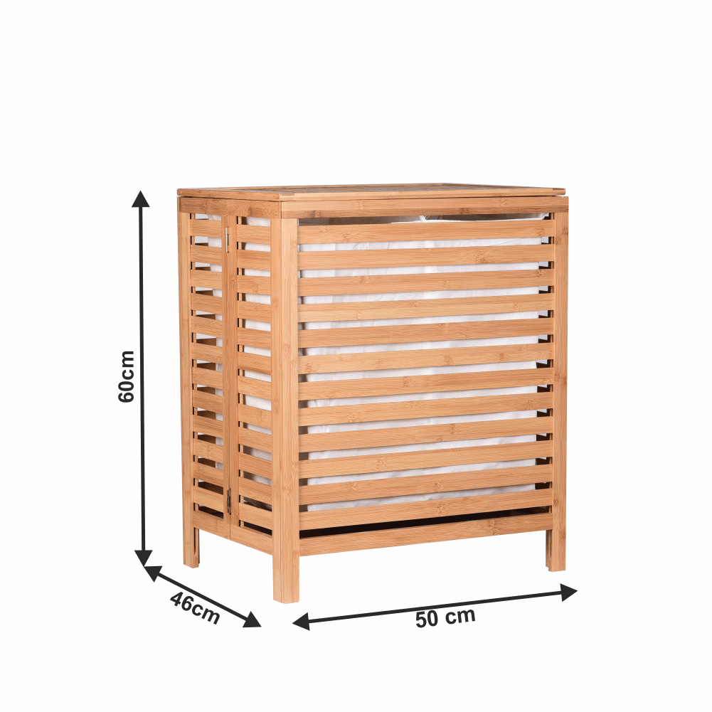 Materiál: bambus / látka Barva: přírodní Rozměry (ŠxHxV): 50x35x60 cm Vyjímatelný látkový pytel Látkové země mohou prát v pračce Objem: 105 litrů Skládací koš Odvětrávaný úložný prostor Úložný prostor rozdělený na dvě části Dodáváno v demontu
