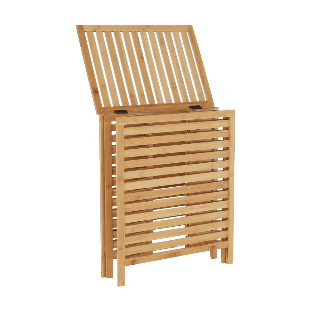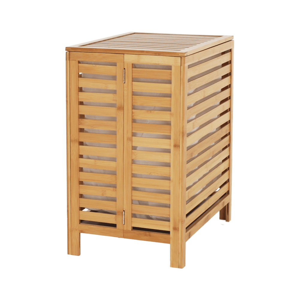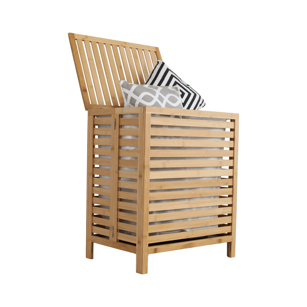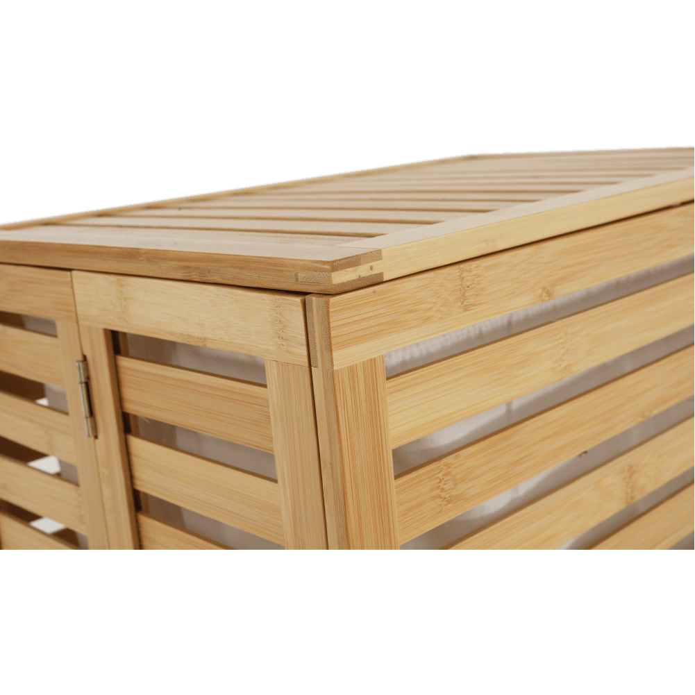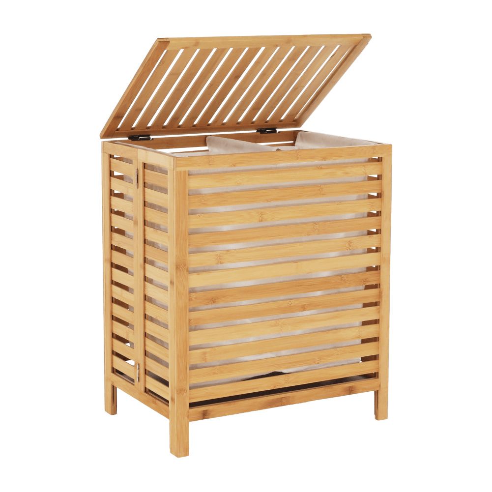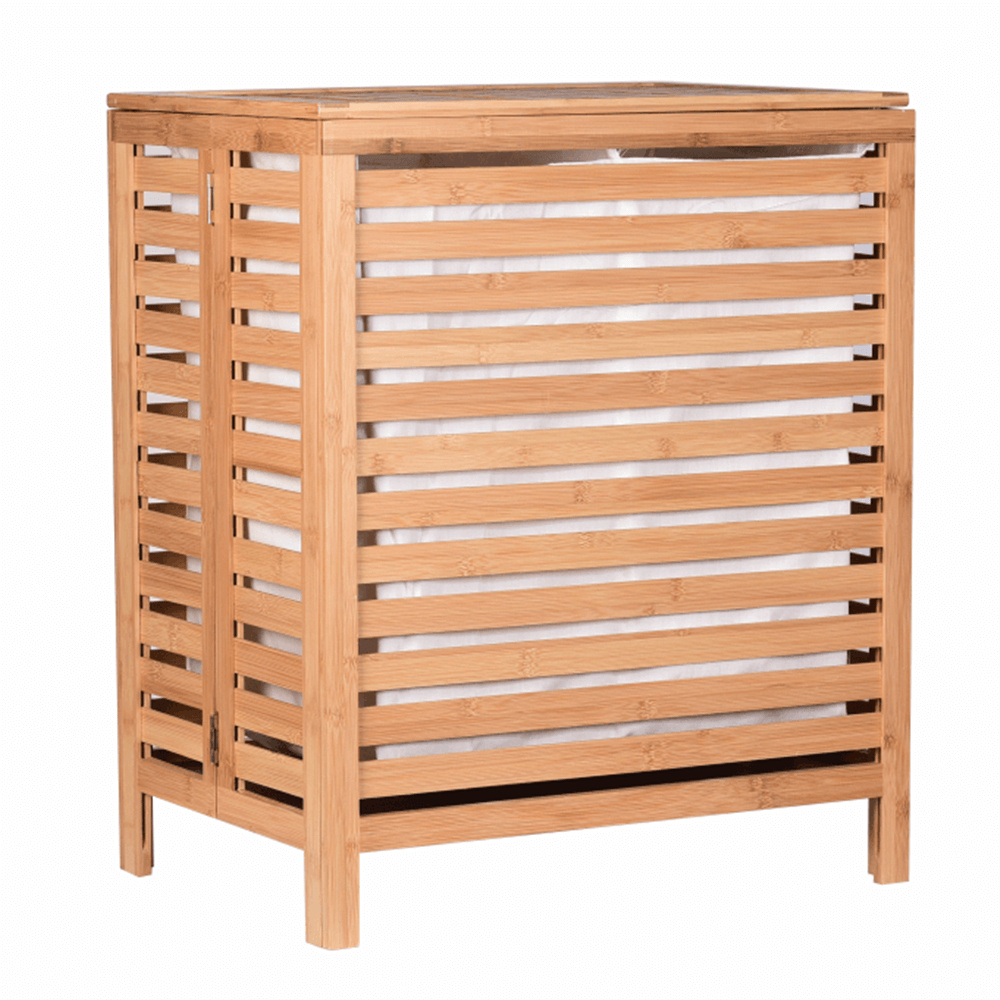 Materiál: bambus / látka Barva: přírodní Rozměry (ŠxHxV): 50x35x60 cm Vyjímatelný látkový pytel Látkové země mohou prát v pračce Objem: 105 litrů Skládací koš Odvětrávaný úložný prostor Úložný prostor rozdělený na dvě části Dodáváno v demontu