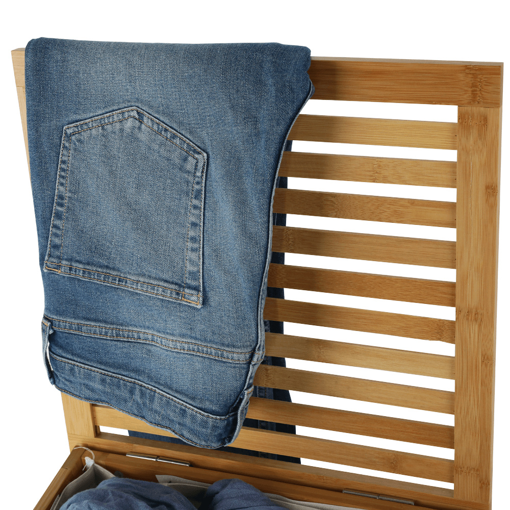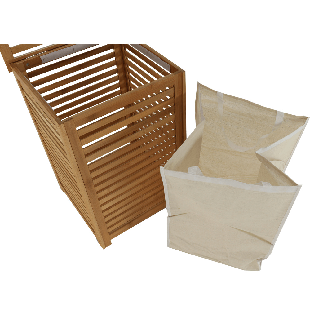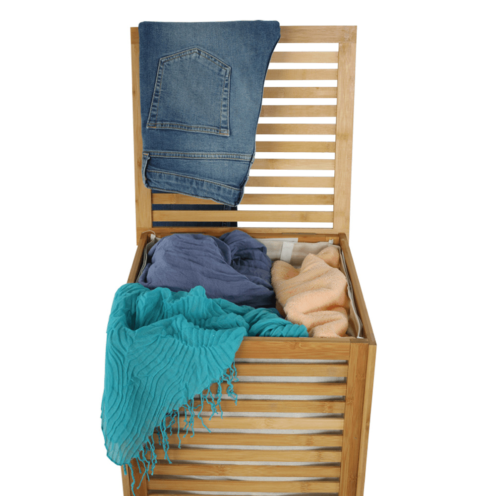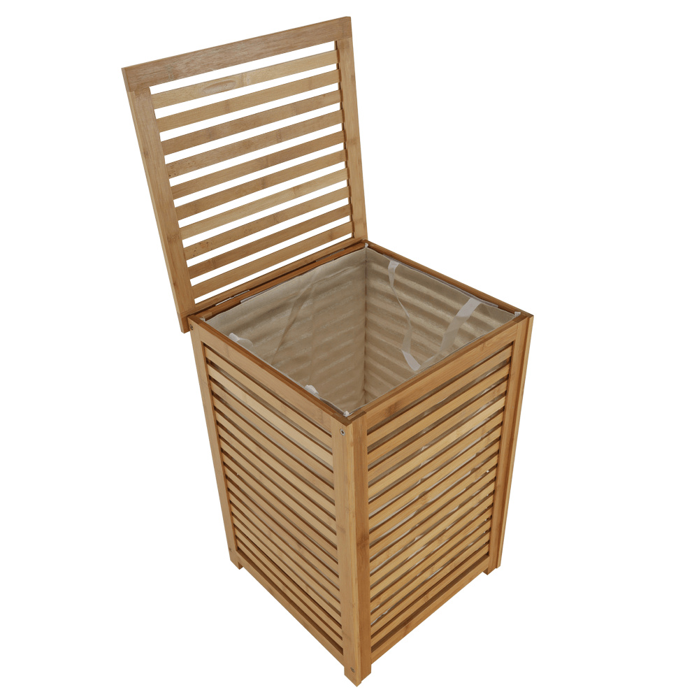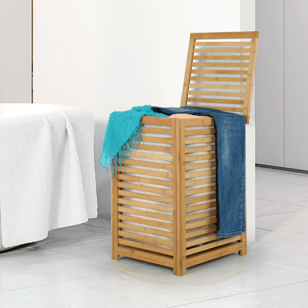 180/5000 Praktický koš na prádlo BASKET Materiál: lakovaný bambus / látka Barva: přírodní bambus / béžová Rozměry (ŠxHxV): 40x40x58 cm S odvětrávacím odkládacím prostorem.