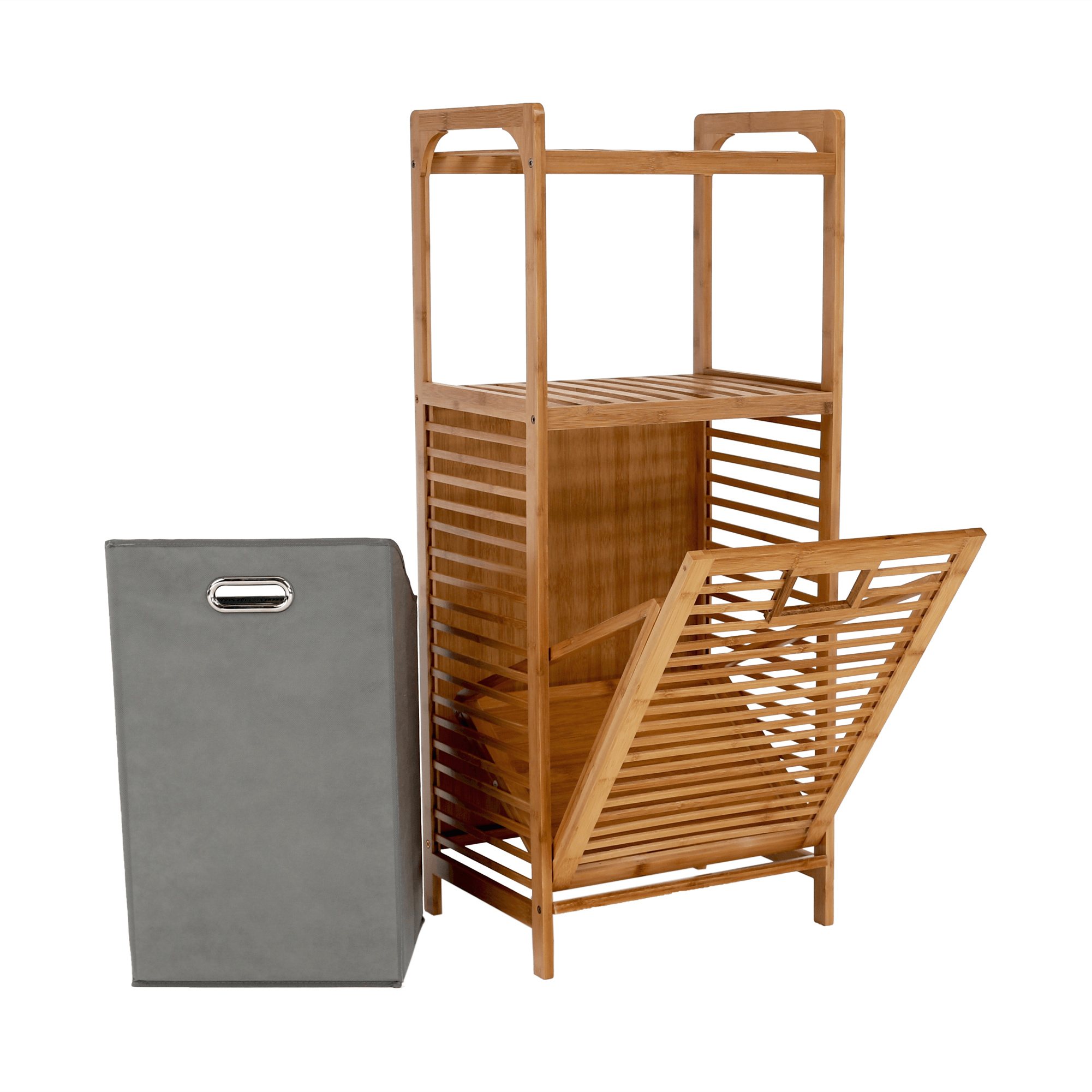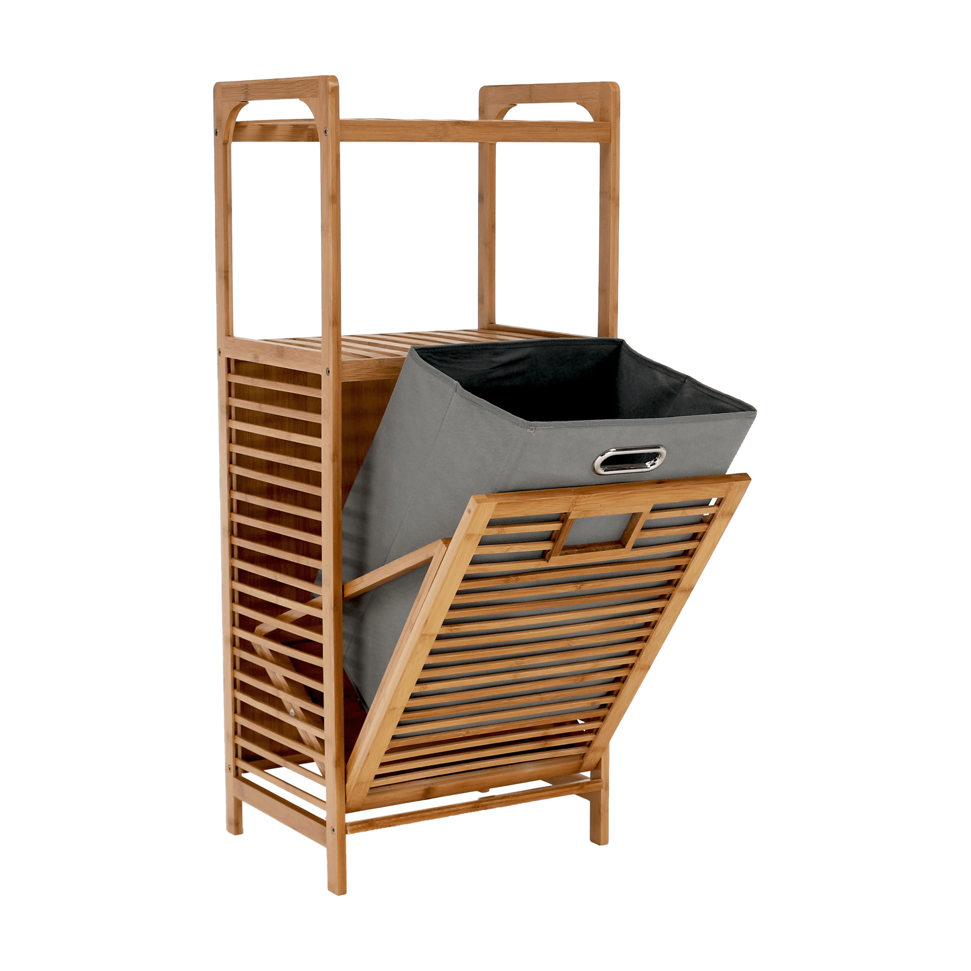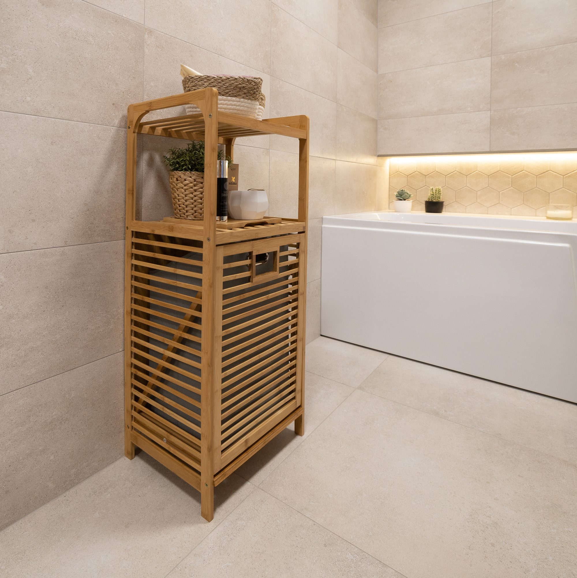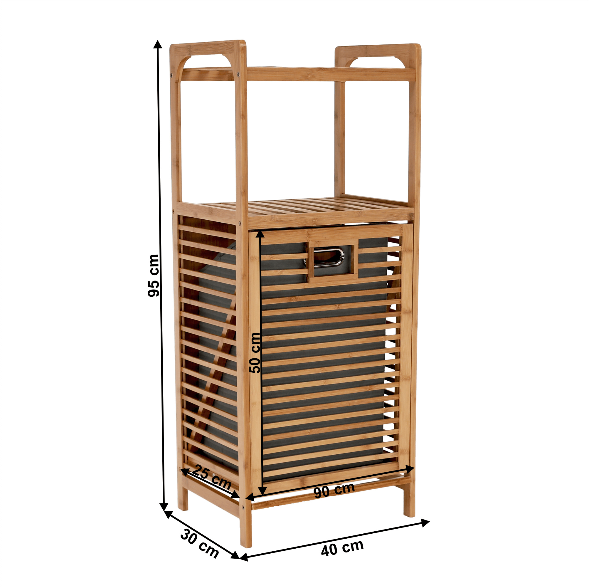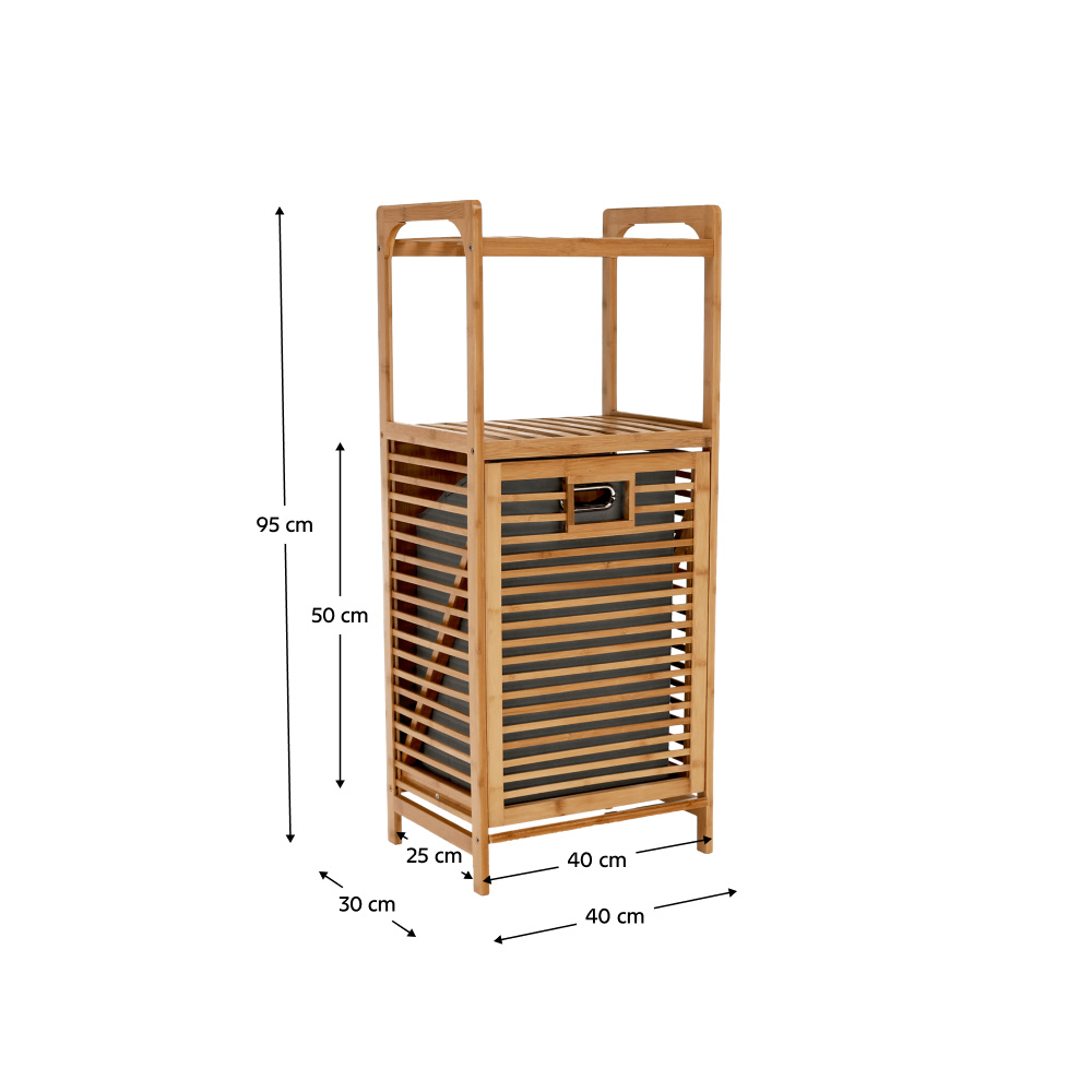 Materiál: bambus lakovaný / látka Barva: přírodní / šedá Rozměry (ŠxHxV): 40x30x95 cm Vnitřní rozměry (ŠxHxV): 40x25x50 cm Vyjímatelné látkové pytel Doporučujeme čistým vlhkým hadříkem Nosnost: 20 kg Dodávané v demonte